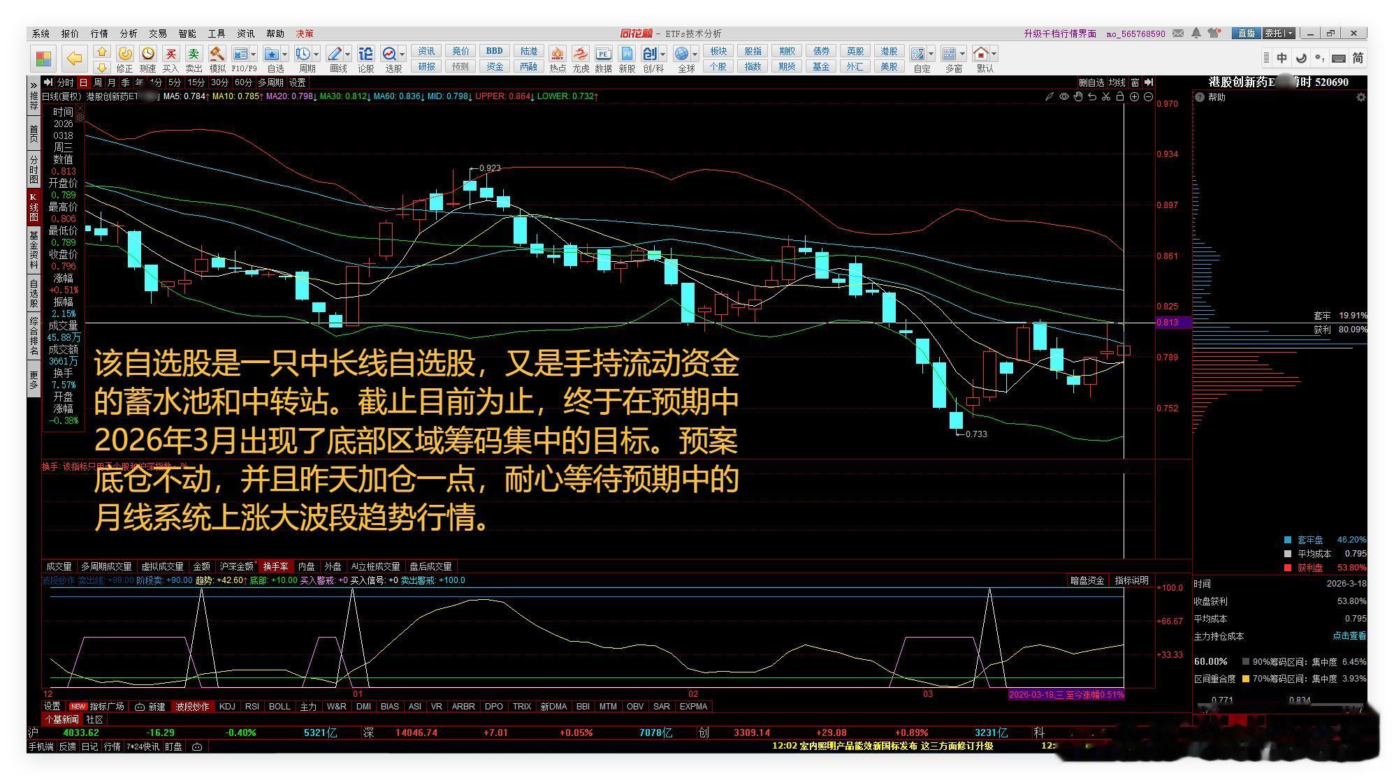 该自选股是一只中长线自选股,又是手持流动资金的蓄水池和中转站。截止目前为止,终于在预期中2026年3月出现了底部区域筹码集中的目标。预案底仓不动,并且昨天加仓一点,耐心等待预期中的月线系统上涨大波段趋势行情。如下图所示:
