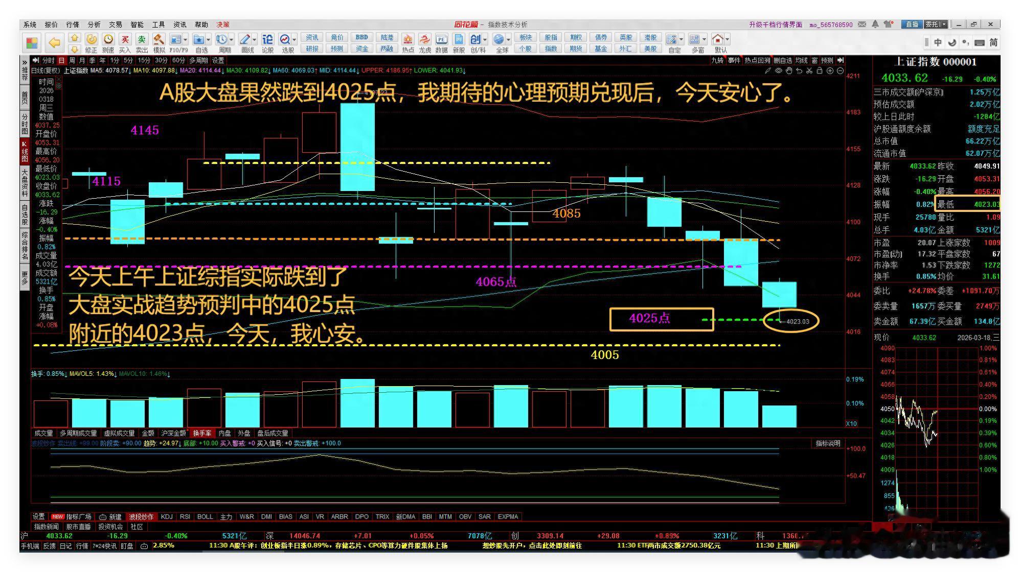 今天上午上证综指实际跌到了大盘实战趋势预判中的4025点附近的4023点,今天,我心安。如下图所示: