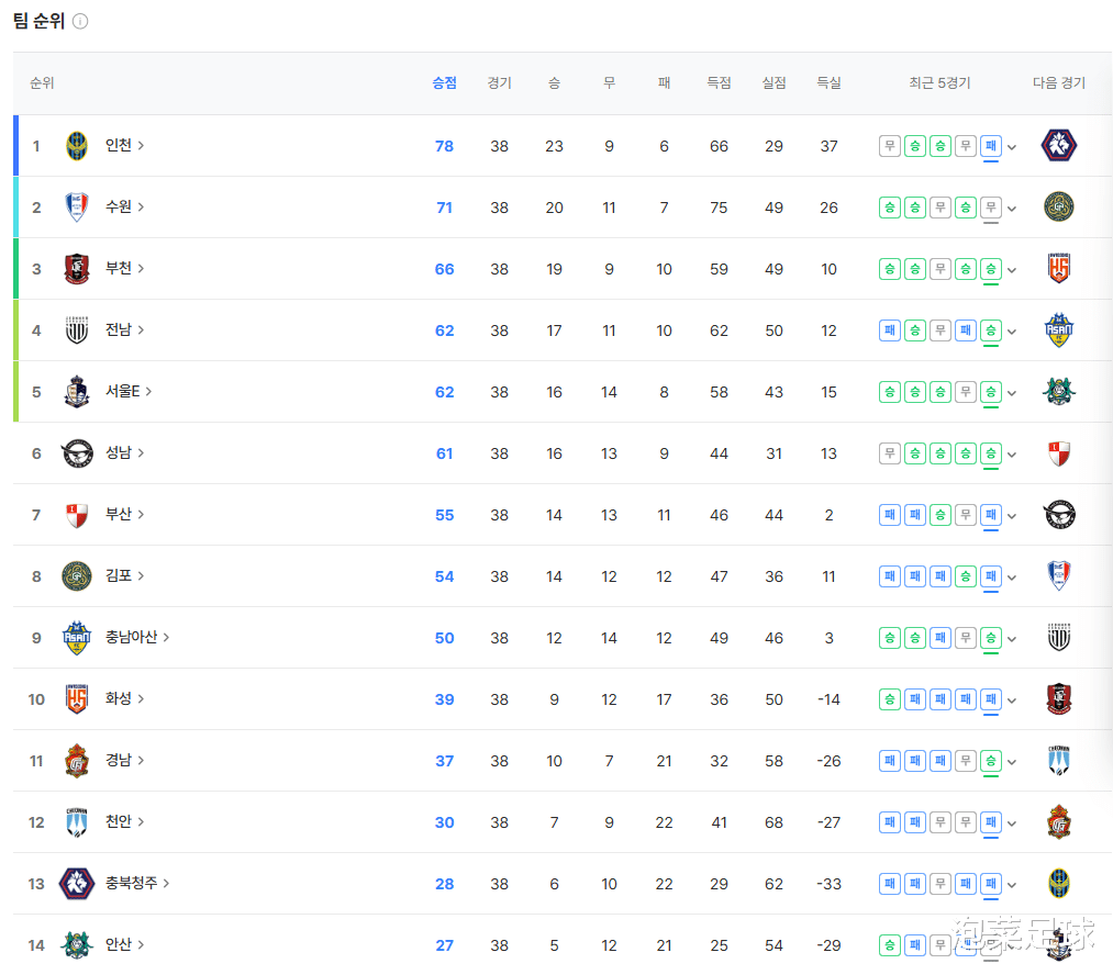 而关于季后赛最后两个名额的争夺也很激烈,首尔衣恋在客场凭借许榕埈和朴昌焕的连续进球,客场2-0击败了忠北清州FC,这场胜利,也让他们成功反超昨天赢球的城南,升至第五位。目前首尔衣恋和第四位的全南天龙都是62分,共同领先第六位的城南1分。
