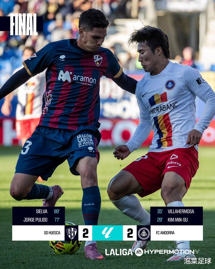 最后我们来看欧洲赛场韩国球员的表现。从周五到周六,共有15名球员登场,其中一名球员完成进球,一名球员完成赛季首秀,下面我们来分别看看一些焦点球员的本轮表现。首先是西乙舞台,之所以将这个联赛提到本新闻的头条,是因为西乙安道尔的韩国小将金旻洙又有进球!在2025-26赛季西乙第13轮比赛客场与韦斯卡的比赛中,以左边锋身份出战的金旻洙不仅表现出色,并且在第28分钟接到队友的传球后,在大禁区外轰出一脚世界波,皮球直挂对手球门死角,为球队取得领先,这也是小金本赛季的第三球。6分钟过后,金旻洙逼抢对手后卫导致其失误丢球,队友截断皮球后,将球吊入空门。