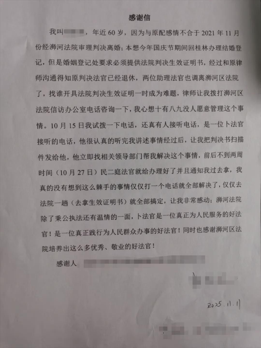 一封感谢信,承载的不仅是群众的认可与感动,更是对浉河法院践行“司法为民”初心的生动诠释。无论法官身在何处,岗位如何变动,为群众排忧解难的职责始终不变。浉河法院干警用行动证明:人民司法,永远在路上;为民服务,没有“退休时”。(金宏辉)