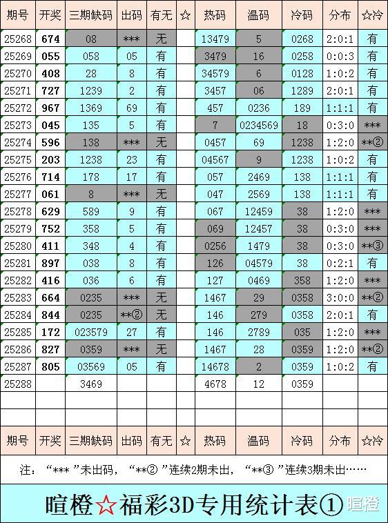 25288期:暄橙福彩3D综合条件(本期将在10月29日21:15开)一、上期回顾 ☆1、上期开奖号:8 0 5。2、和值= 13,跨度= 8。3、常态组六,022路组合。4、热度分布(热:温:冷)1:0:2。5、上期三胆有5,断组错(1:1:1)。二、本期条件 ☆1、三期缺码:3469。2、热:4678,温:12,冷:0359。3、断组分解式:1267//034-589。4、四胆:④⑥⑧⑨;三胆:④⑧⑨。5、近期适当关注热度(热:温:冷)1:1:1。①假定“热度(热:温:冷)1:1:1”成立,得出32注组选:014,016,017,018,024,026,027,028,134,136,137,138,145,149,156,157,158,169,179,189,234,236,237,238,245,249,256,257,258,269,279,289。②继续假定“三胆出码”,得出20注组选:014,018,024,028,134,138,145,149,158,169,179,189,234,238,245,249,258,269,279,289。三、术语解释 ☆1、三期缺码:0至9这十个自然数当中,未在近三期开奖号出现的数字。2、热度(热温冷):自然数0至9,在近七期开奖号中,出现3次及3次以上的数字,称为热码;出现2次的数字,称为温码;出现1次和未出现的数字,称为冷码。某个数字在开奖号中出现几个,就按几次计算。3、断组分解式:将0至9这十个自然数,分成三组数字,从前往后依次为A组(4码)、B组(3码)、C组(3码),一般情况下,有一组数字不出码,偶尔会有两组数字不出码。A组不出码的情况相对较少。断组为主,分解为辅。4、常态组六号码:同时包含大数、小数、奇数、偶数、质数、合数的组六号码,共有72注。统计表中,简称“常态”。5、非常态组六号码:全大数、全小数、全奇数、全偶数、全质数、全合数等六种形态的组六号码,共有48注。统计表中,简称“非常”。★提醒:彩市有风险,参与须谨慎!理性购彩,量力而行!多看少买,不要痴迷!任何条件都有出错的时候!水平有限,仅供参考!友好互动,好运相伴!