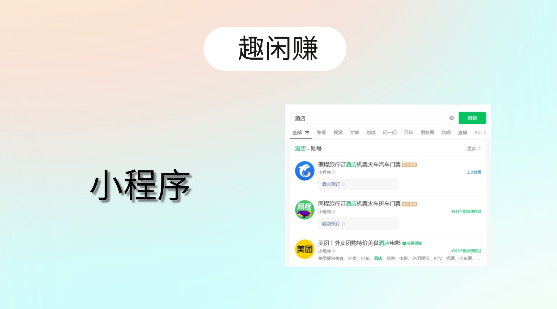 虽然不是一个网页,也不是一个App,不过小程序也可以通过搜索直接搜索到的!所以可以搜索小程序的关键词和描述,增加关键词在搜索的排名,搜索的流量非常大,优化的好可以增加很多流量