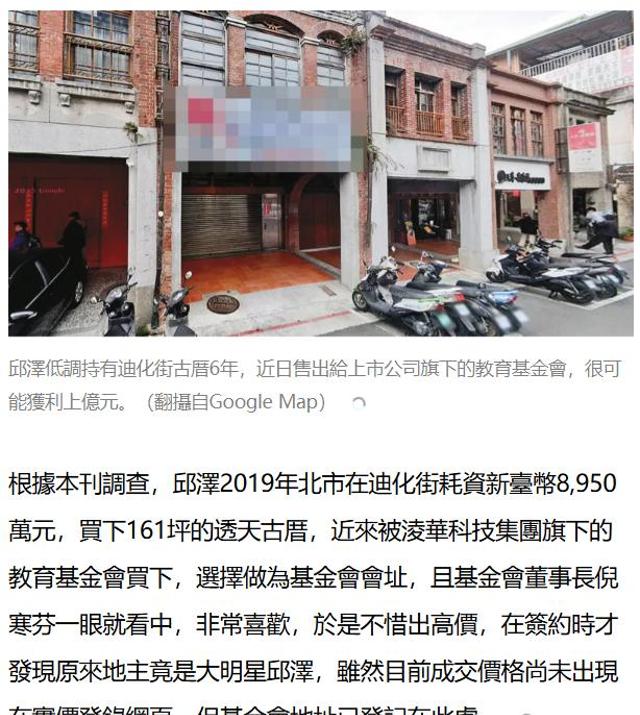 另外,台媒爆料两人好运从天降,在怀孕期间,邱泽名下的8950万台币古宅,遇到“拆迁”,近期被某科技集团的教育基金会买下,作为基金会的选址,该集团董事长很喜欢这块地,不惜高价购入,虽然没有公布价格,但附近的房子成交价在1.7亿台币左右,折合人民币4137万。