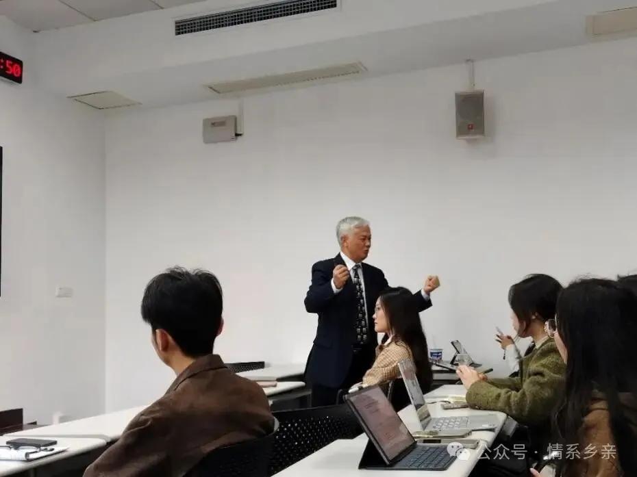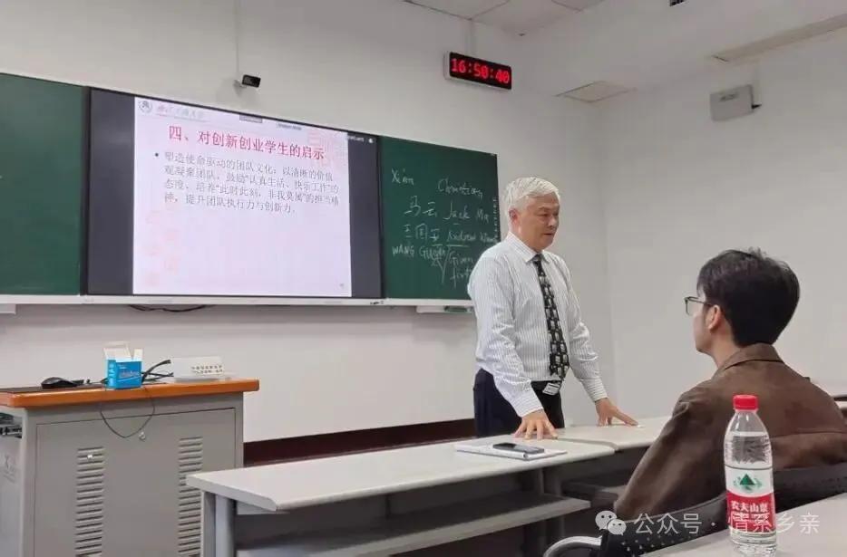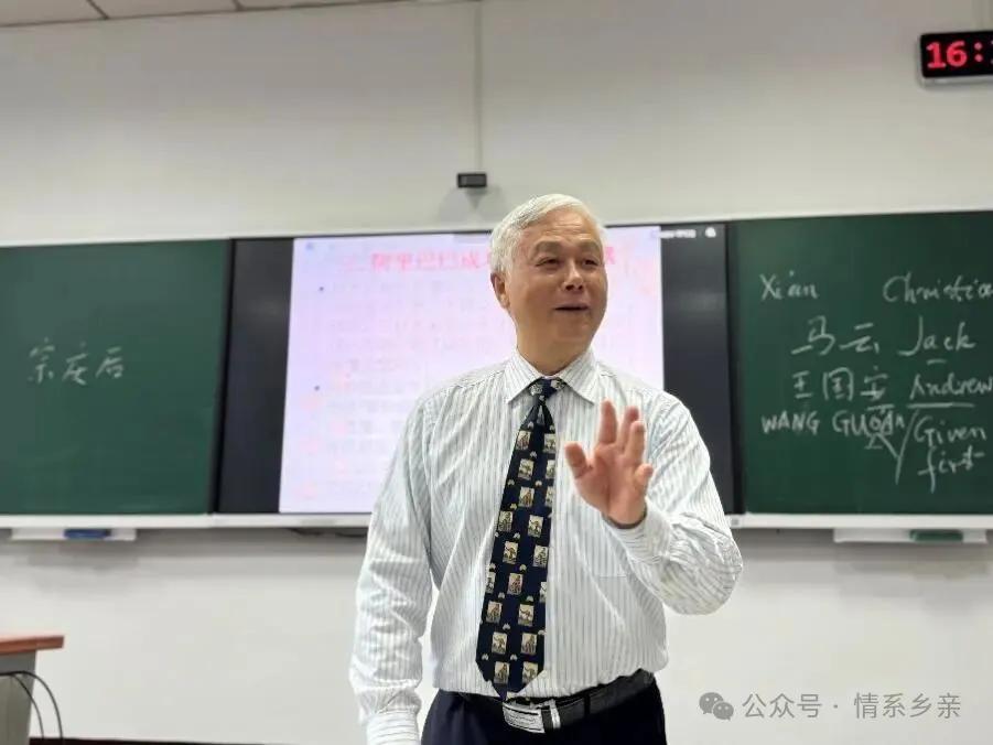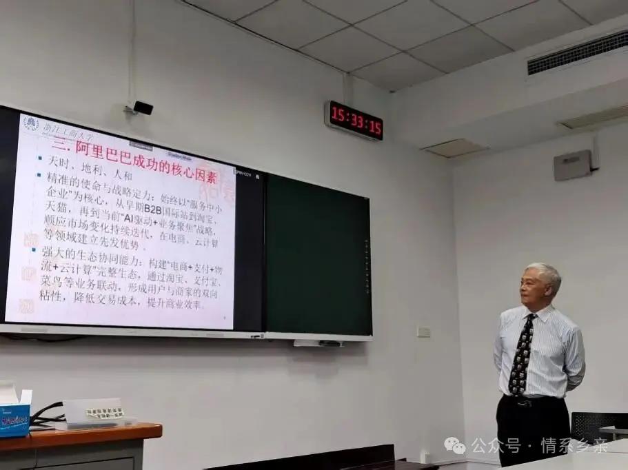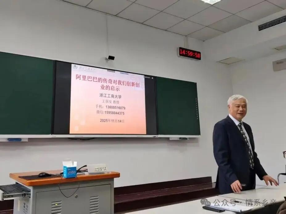 王国安教授为在场师生带来了一场思想激荡的分享。他结合自身早年在湖南大学求学的经历,以及后续参与培养中国首批电商人才的实践背景,围绕阿里巴巴的创立历程与成功要素展开深入讲解。王教授的讲授高度即兴、案例纷呈,语言生动、互动频繁,在轻松而不失深度的氛围中,引导听众从多维度了解浙江优秀的营商环境及以马云、宗庆后为代表的浙商的成功秘笈。