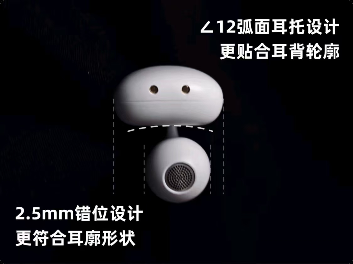 佩戴方面:为了更舒适的佩戴体验,虹觅采用了独特的2.5mm的错位设计,这种设计更符合人体原理,耳机戴上后,会呈现出一高一低的状态,相比于传统的对称式结构,更加舒适,耳机的电池部分更是采用了∠12的弧面耳托设计,提供了更好的支撑作用,再加上耳机自重仅为4.5g,非常的轻盈,佩戴很舒适,戴上一整天也不会觉得累。