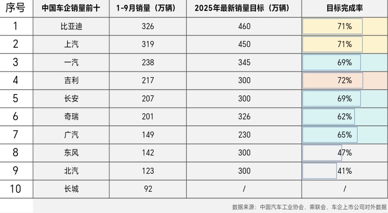 第二梯队中,吉利汽车表现抢眼,217万辆的累计销量和72%的目标完成率,使其成为当之无愧的“增长标杆”。