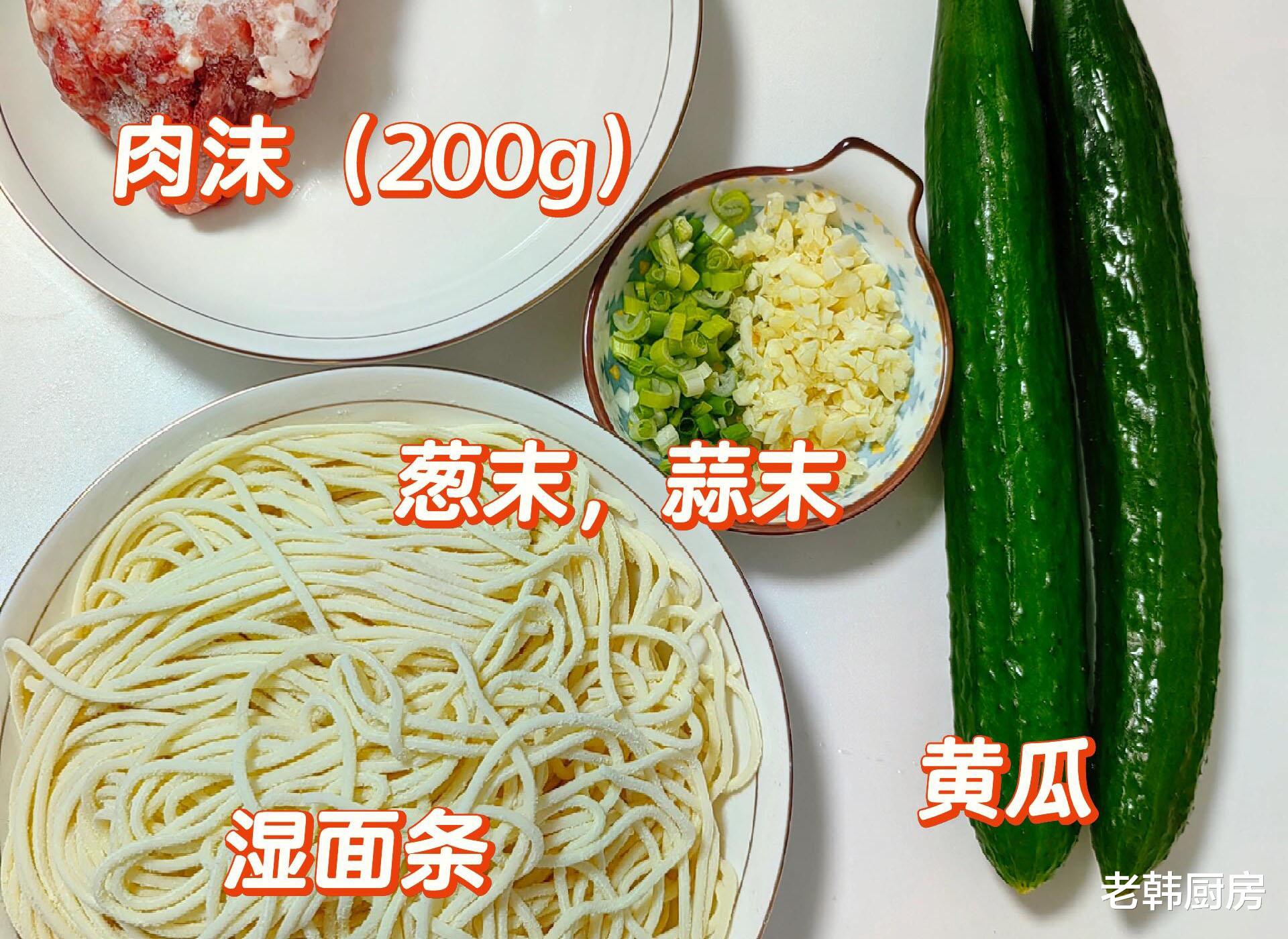 食材准备:面条(约一斤二两)、肉沫(200 克)、黄瓜(切丝备用)、葱末、蒜末