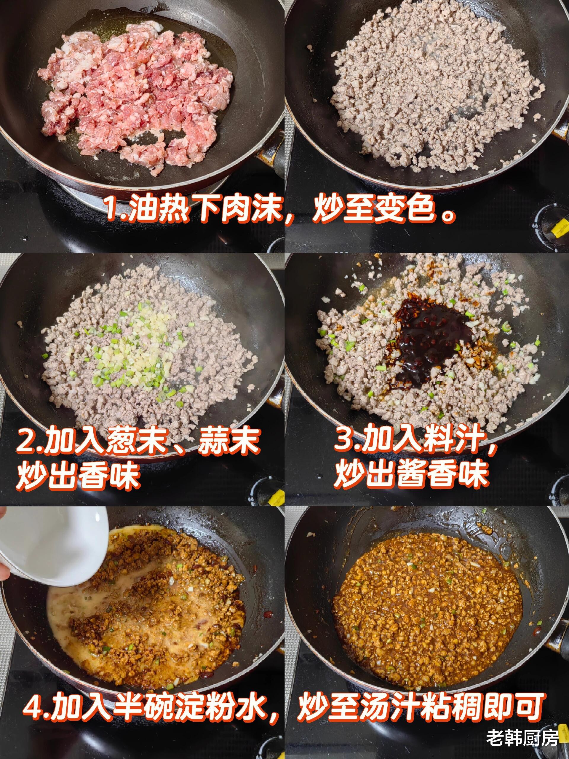 这时候加入切好的葱末和蒜末,继续翻炒,不一会儿,就能闻到葱蒜的香味了,和肉沫的香气融合在一起,简直太香啦!接着把调好的料汁倒入锅中,快速翻炒均匀,让每一粒肉沫都裹满料汁,炒出浓郁的酱香味。