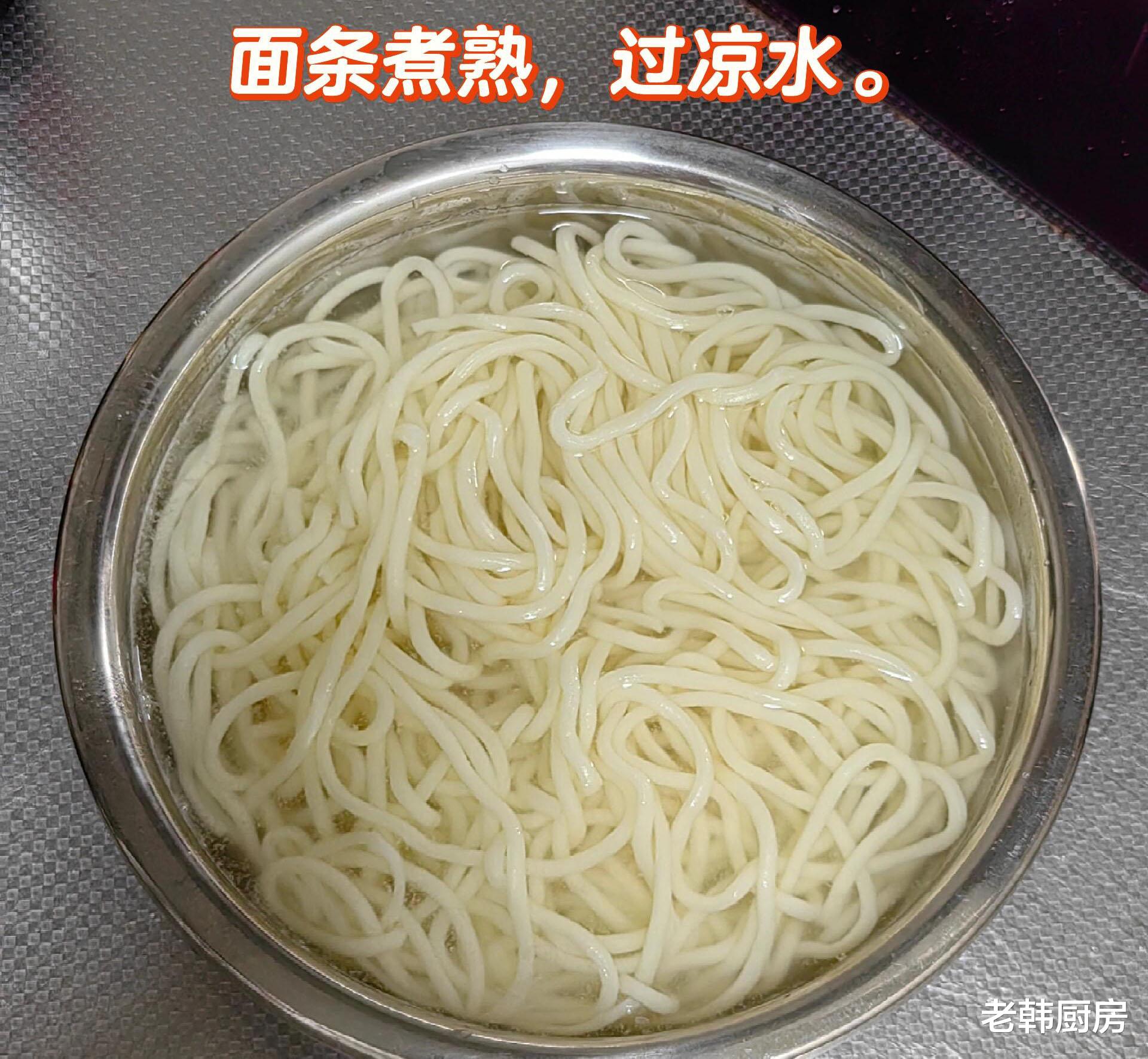 4、另起一锅,加入适量的水,水开后把面条放入锅中煮熟。煮好的面条捞出来,放入凉开水中过一下凉,这样面条会更劲道,口感更好。过凉后的面条捞出来,沥干水分,盛入碗中备用。