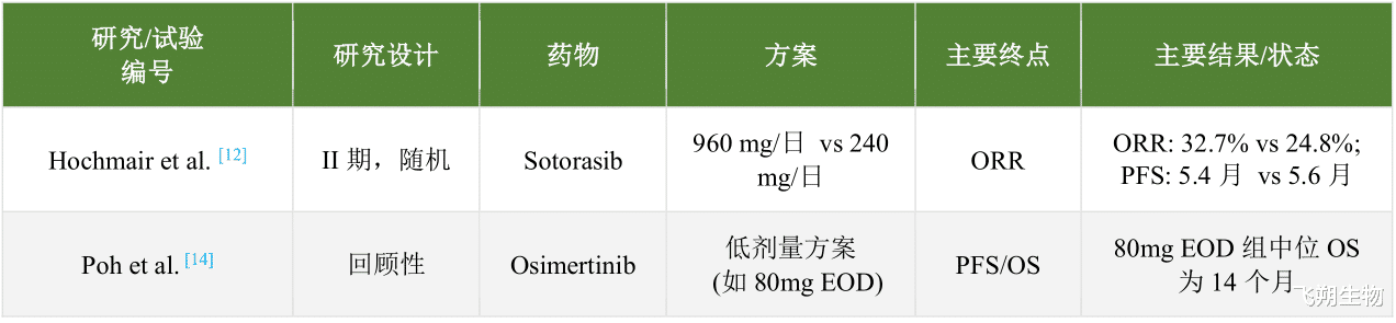 索托拉西布(Sotorasib):在针对KRAS G12C突变NSCLC的Codebreak-100试验中,240mg/天的低剂量组与960mg/天的标准剂量组相比,PFS相似(5.4 vs 5.6个月),但客观缓解率(ORR)数值上略低(25% vs 33%)[12]。这说明并非所有药物减量都无损疗效,需要更多研究来界定。