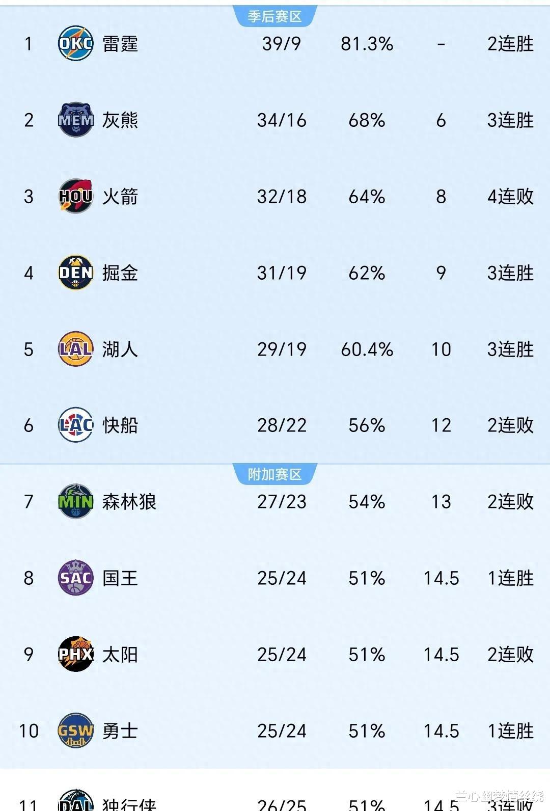 除了以上两场比赛,其他比赛的结果也对西部排名产生了重大影响。火箭队遭遇四连败,排名进一步下滑;独行侠队也遭遇失利;而勇士队则受益于其他球队战绩的变化,重回西部前十。目前,西部第三到第五名的球队之间胜场差距仅为2场,竞争异常激烈;而第八名更是由勇士、太阳等四支球队同分争夺,形势扑朔迷离。