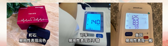 测评方法:邀请青年、中年、老年这3个不同年龄段的用户使用这三款血压计,记录每个人每款设备从启动到测量完成所耗费的时间,并让每个人对每款设备的易用性进行打分。