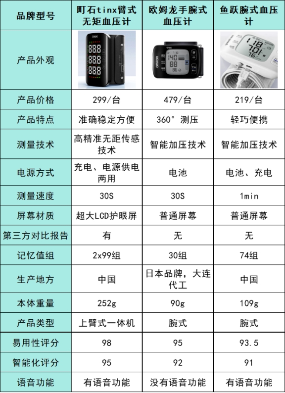 测评结果: 町石 > 可孚 > 鱼跃町石血压计智能化测评表现:町石的智能化功能,我觉得做得相当不错。语音播报特别清晰,还能提醒你佩戴是否正确,这点对我来说特别实用,尤其是视力不太好时。查询历史数据也特别方便,几秒钟就能看到之前的记录,操作简单易懂。房颤监测功能也很有用,设备一旦检测到异常,立马就会提醒,让人心里踏实。整体来说,町石血压计的智能化功能非常全面,适合喜欢高科技体验的朋友。可孚血压计智能化测评表现:可孚的智能化表现算得上是中规中矩吧。语音播报能清楚告诉你测量结果,但有时语速和音量对听力不太好的人可能会有点挑战。查询历史数据功能虽然简单,但操作稍显迟缓,不如町石那么敏捷。房颤监测虽然有,但偶尔会有一些误差,准确性不算特别高。总的来说,可孚的智能化功能还可以,但在细节上需要一些提升。鱼跃血压计智能化测评表现:鱼跃的智能化功能是比较基础的那种。语音播报还算清晰,但是语速快了一些,有时候有些人可能跟不上。查询历史数据的反应时间也稍微长了一点,不是特别迅速。至于房颤监测,虽然可以检测到一些异常,但准确度稍逊色于前两款,反馈也没有那么迅速。总的来说,鱼跃血压计在日常使用上够用,但智能化的表现还有待提高。