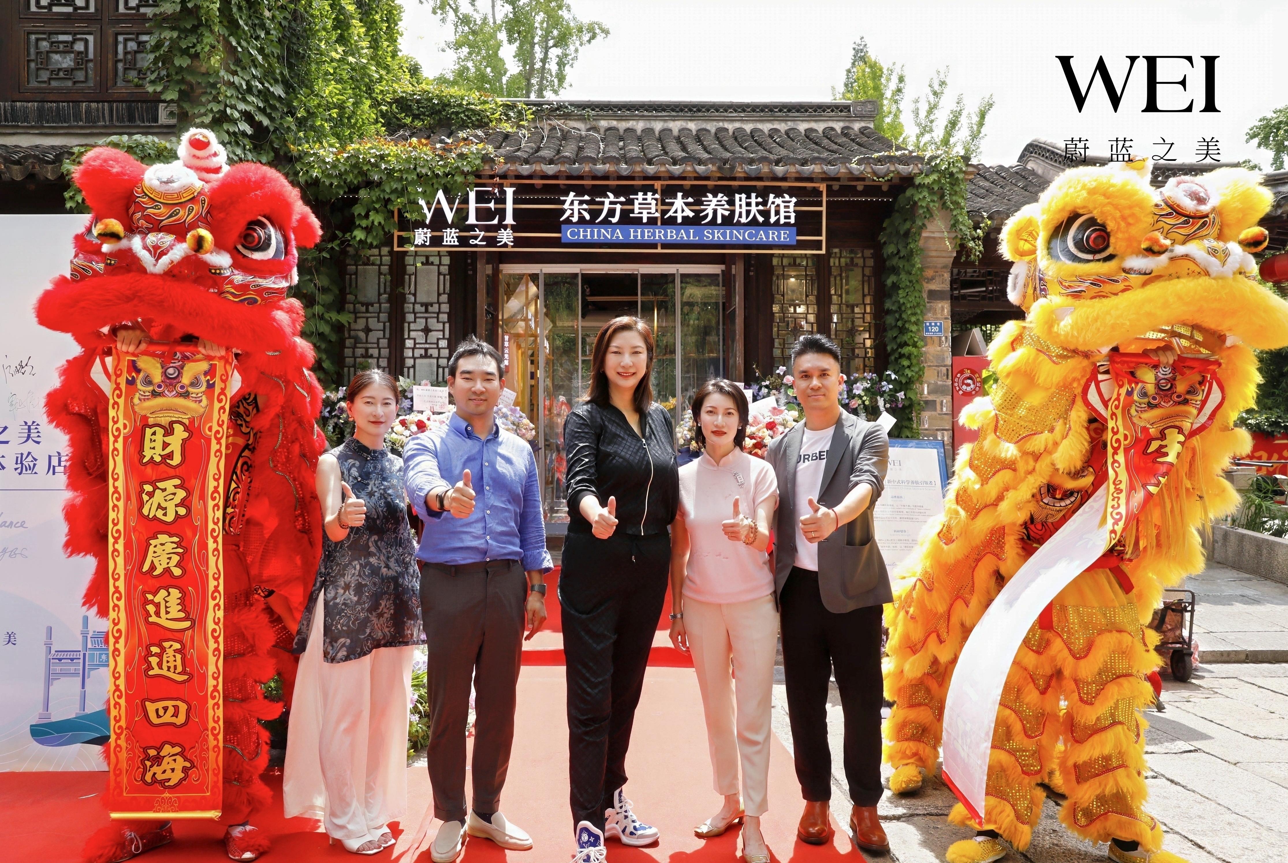 WEI蔚蓝之美南京店内根据目前的生意模式,精选品牌旅行装、南京老门东限定礼盒及东方生活美学衍生品,为消费者呈现一场跨越时空的草本养肤之旅。豫园股份副总裁陈晓燕女士、豫园化妆品集团总裁助理、WEI蔚蓝之美总经理潘菁女士、豫园美丽健康集团战略部总经理阙振元先生、豫园美丽健康集团CHO郭娟女士和WEI蔚蓝之美品牌副总经理蔡青先生为新店剪彩揭幕。