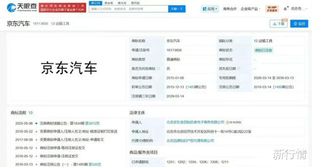 此外,值得一提的是,天眼查显示,京东还注册了多枚有关汽车的商标,如“京东汽车”、“京东汽车 JD AUTO”、“京东汽车 CAR.JD.COM”,当前部分商标已注册成功。