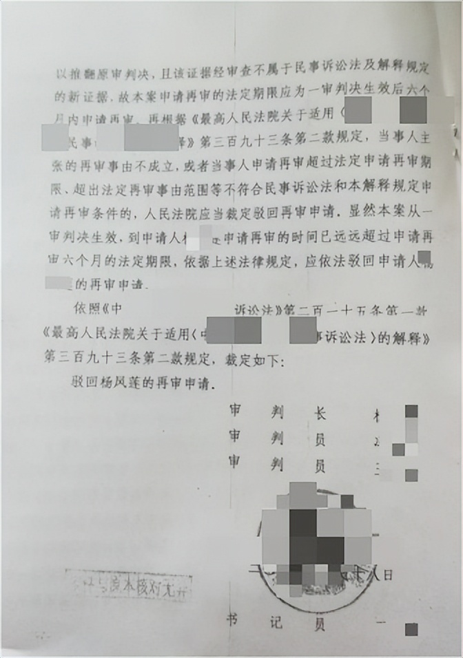 法院方面给出的驳回再审申请理由显示,杨某莲申请再审的时间已超过一审判决生效后六个月的法定再审期限,且其主张的再审事由不成立,不符合民事诉讼法及相关司法解释规定的申请再审条件,因此依法驳回其再审申请。
