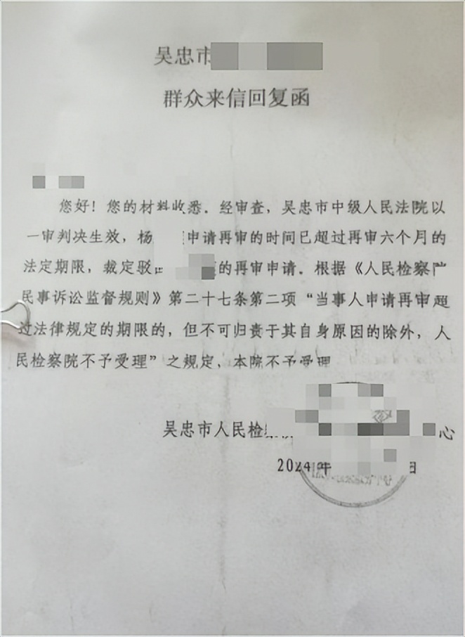 吴忠市人民检察院的群众来信回复函也明确,因杨某莲申请再审超过法律规定期限,且无不可归责于其自身的原因,根据《人民检察院民事诉讼监督规则》相关规定,决定不予受理。