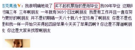 面对着种种的猜测和质疑,吉克隽逸不得不站出来回应,她说自己买不起飞机票是在大学刚毕业的时候,不是现在,现在自己可以接一些商演了,都能买得起奢侈品了。就这样,靠着和网友们打了一个时间差,吉克隽逸成功地淡化了自己蹭卖惨流量的丑闻。