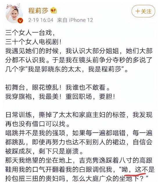 吉克隽逸:观众希望你立刻闭麦除了这些让网友们下头的事件,吉克隽逸的情商低得也让网友们纷纷称大开眼界了。在乘风波浪的姐姐中,程莉莎有一期被淘汰了,在人家心里觉得自己并不是唱跳专业出身的,而且几乎毫无功底,但是为了这个节目也是付出了很多的辛苦,所以被淘汰了很绝望、很难受。但就当程莉莎颓废地坐在了地上,吉克隽逸却踩着八厘米的高跟鞋来到了程莉莎身旁,用轻蔑的语言向程莉莎说了句,这不是拎个包就得扭三扭的贵妇吗,这么珍贵的身躯,怎么坐在了地上了?面对这种讽刺的话语,程莉莎更加难过气愤了,所以在微博上发了一篇长文章,来斥责吉克隽逸的无礼。