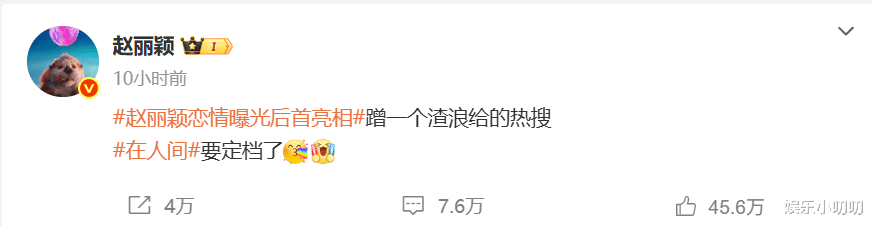 5月22日,赵丽颖因自己新剧《在人间》即将上映在个人社交平台对该剧进行宣传,然而令人没想到的是赵丽颖竟然自己挂上了#赵丽颖恋情曝光后首亮相#的词条,一时间引发广大关注。赵丽颖还配文称:蹭一个渣浪给的热搜。这个词条的起因是赵丽颖22日参加了一线下活动,这也是和赵德胤传出恋情后,赵丽颖的首次露面,没曾想赵丽颖竟然自己cue到这个词条,网友纷纷猜测这是官宣恋情了吗?
