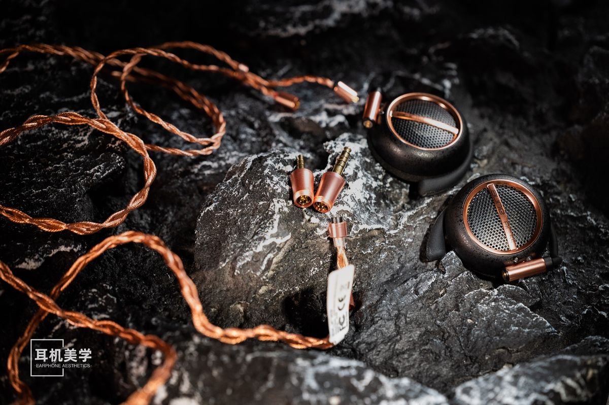 它的直径约 45mm,覆盖耳廓的面积几乎与压耳式头戴耳机相当。不过得益于耳挂式设计无需头梁夹持,aune 还特别为其定制了一对亲肤材质的半记忆合金耳挂,长时间佩戴后耳廓也不会产生不适感。外观方面,AC55 以黑色类火山岩的浮点工艺为基底,后滤网边框和接口连接处点缀着玫瑰金色。看过 AC55 详情页的人估计会发现,外壳的浮点工艺其实与振膜的样式相呼应。这种设计既丰富了 AC55 的设计内涵,又让它更具现代感,与传统耳挂式耳机的古董感形成鲜明对比。