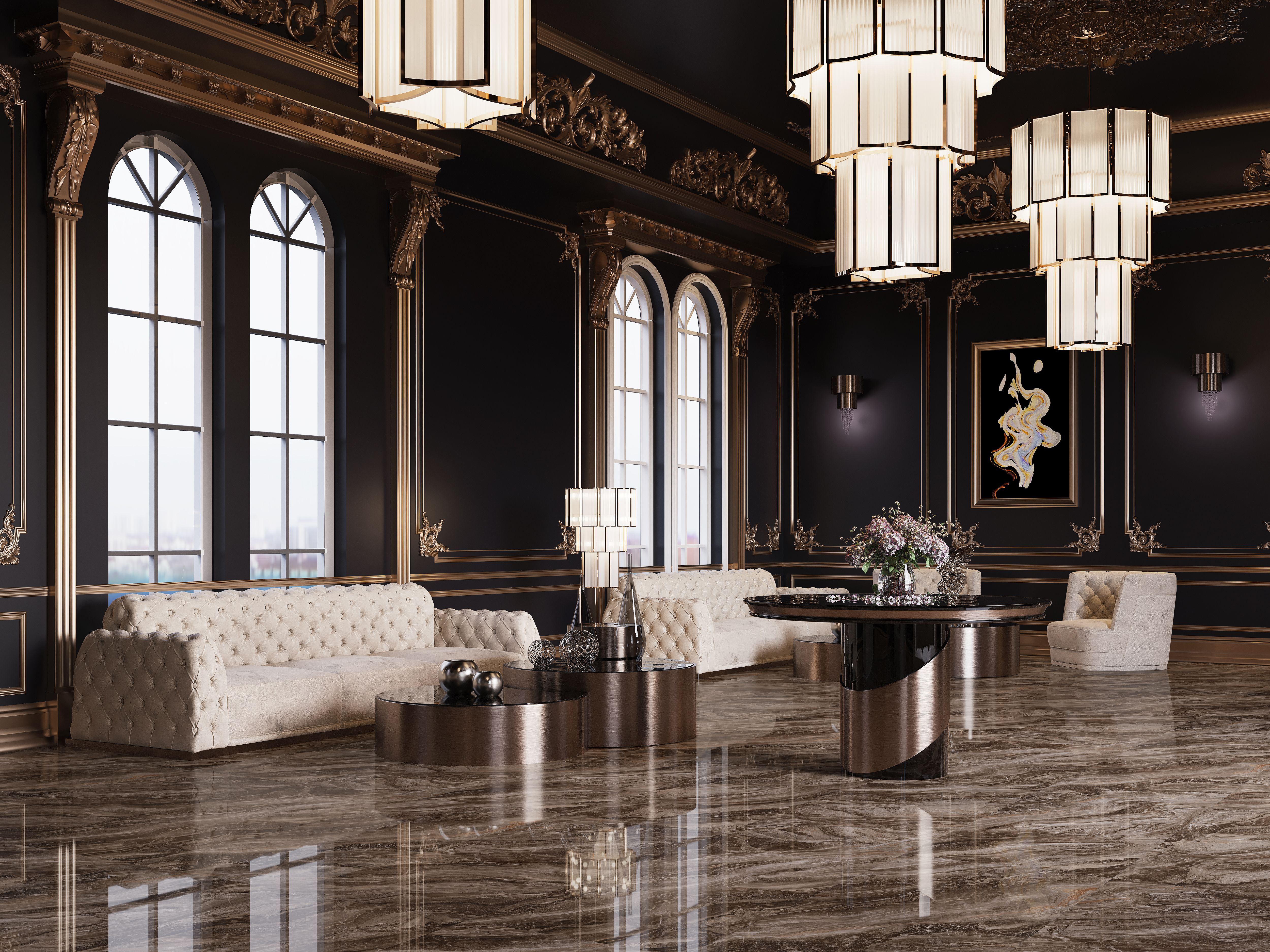 国际瓷砖品牌罗曼缔克威尼斯棕瓷砖纹理如天然大理石般,呈现出深浅交错的棕褐与灰调,仿佛是时光在石材上镌刻的印记,自带浓郁的复古韵味。其表面的高光处理,又赋予了空间现代感的精致光泽,让别墅客厅在视觉上先声夺人。在这个案例中,国际瓷砖品牌罗曼缔克威尼斯棕瓷砖铺满整个客厅地面,成为连接各个功能区域与装饰元素的纽带,既提升了空间的整体质感,又通过纹理的自然流动,让偌大的客厅不显空旷,反而充满了层次与故事感。