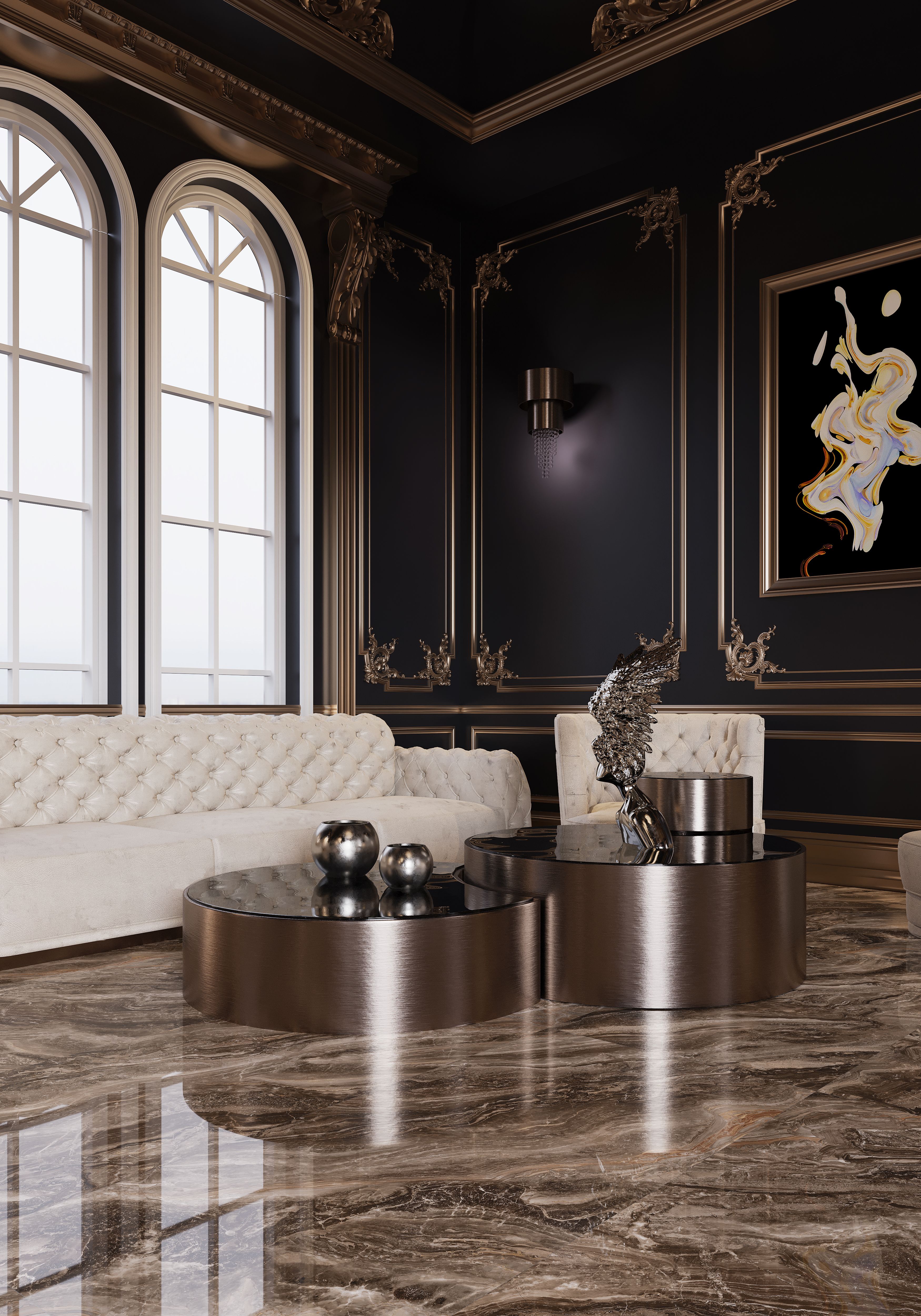 客厅墙面采用了深黑色的哑光涂料,搭配金色的欧式线条与雕花装饰,打造出经典的黑金配色组合。深黑的沉稳与金色的华贵相互映衬,而国际瓷砖品牌罗曼缔克威尼斯棕瓷砖的棕褐基调则在其中起到了完美的过渡作用,中和了黑与金的强烈对比,让空间氛围既奢华大气,又不会过于张扬。白色的 tufted(簇绒)沙发、金属质感的茶几与装饰摆件,在国际瓷砖品牌罗曼缔克威尼斯棕瓷砖的衬托下,更显精致,形成了一幅色彩层次丰富的奢华画卷。