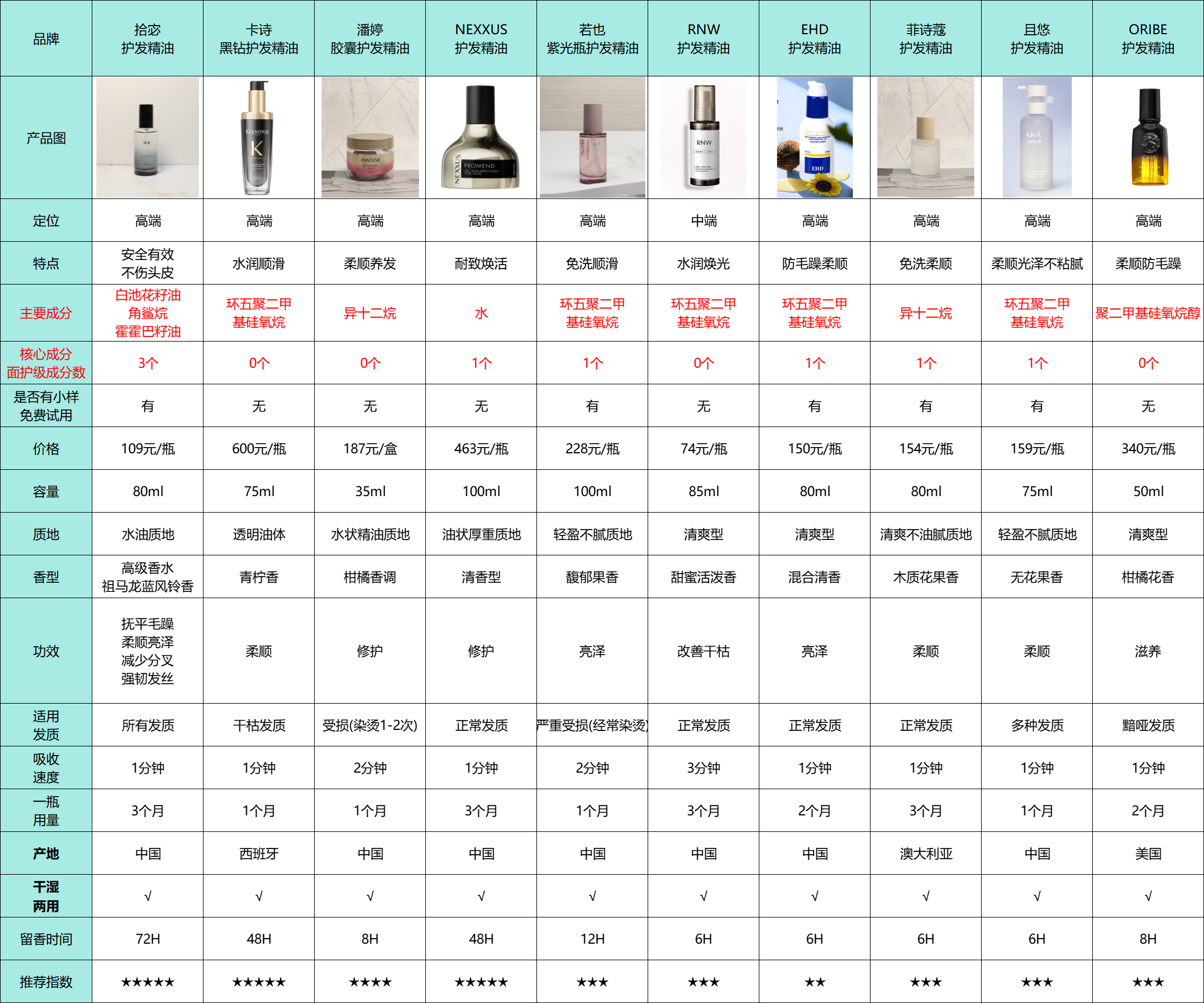 每次有人问我怎么挑护发精油,我第一反应都是:先看数据!真的,别嫌麻烦。因为数据会告诉你它到底适不适合你的发质,比如油性头皮、干枯毛躁、染烫损伤的表现完全不一样。为了说得更清楚,我把这次测评的几款护发精油整理成了表格,成分、吸收、使用后的手感都列进去了,自己看会更直观。