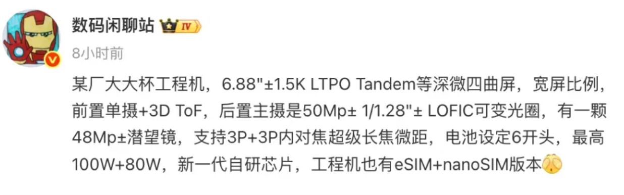 “某厂大大杯工程机,6.88英寸± LTPO Tandem 屏,50Mp 主摄+可变光圈+48Mp 潜望长焦,100W+80W 双快充,新一代自研芯片,eSIM + nanoSIM 双版本。”