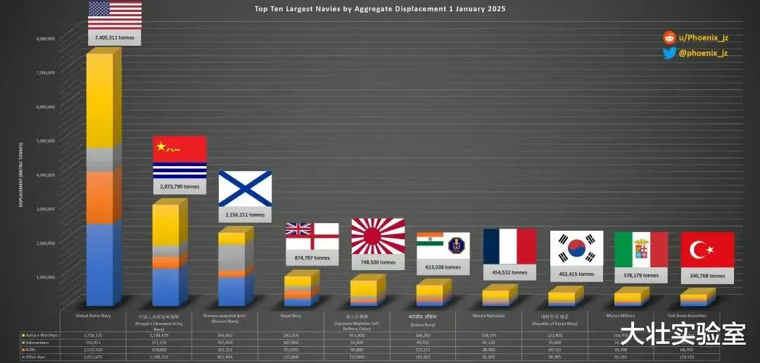 近日,一名外国博主根据各国的公开数据,制作了2025年全球海军力量对比柱形图,排名前10的分别是美国、中国、俄罗斯、英国、日本、印度、法国、韩国、意大利、土耳其。其中美国海军的舰艇总吨位达到了740万吨,依然是断崖式的遥遥领先,而中国海军的总吨位达到了297万吨,俄罗斯则为215万吨。虽然中俄海军的吨位看起来差距不大,但是俄罗斯海军几乎所有的大型水面舰艇,都是苏联遗留下来的,俄海军的总吨位正在快速下滑,中国海军的总吨位则会继续快速上升,中国海军已经是名副其实的远洋作战海军,俄罗斯海军则已经退化为近海作战舰队。