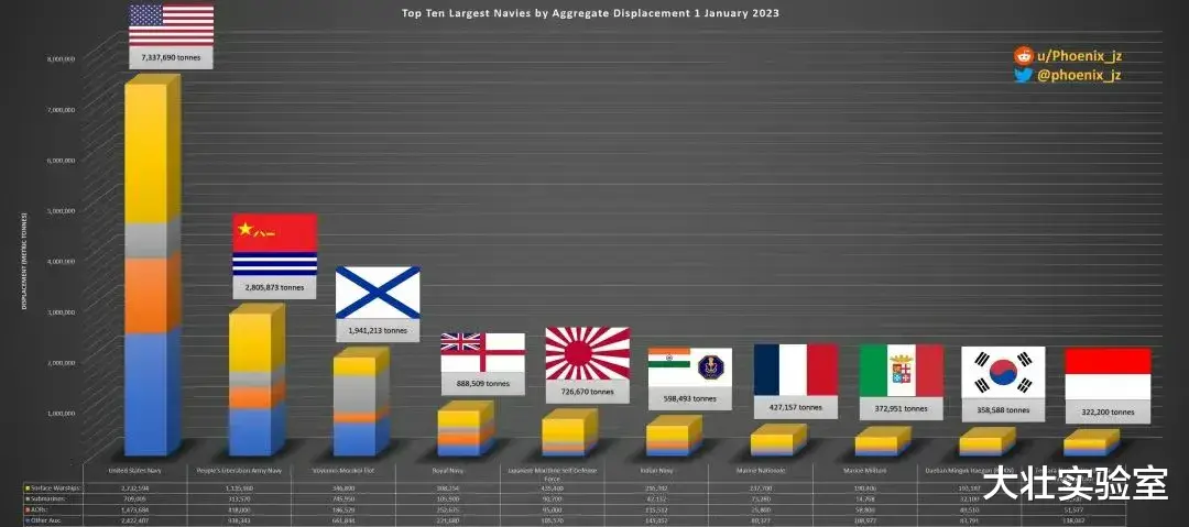 2023年的时候,美国海军的总吨位为733万吨,中国海军为280万吨,在过去2年的时间里,美国海军的总吨位增加了6.8万吨,中国则足足增加了16.7万吨,考虑到美国海军的舰艇平均舰龄远大于中国海军,只要中国维持住目前的造舰势头,总吨位超越美国只是时间问题。
