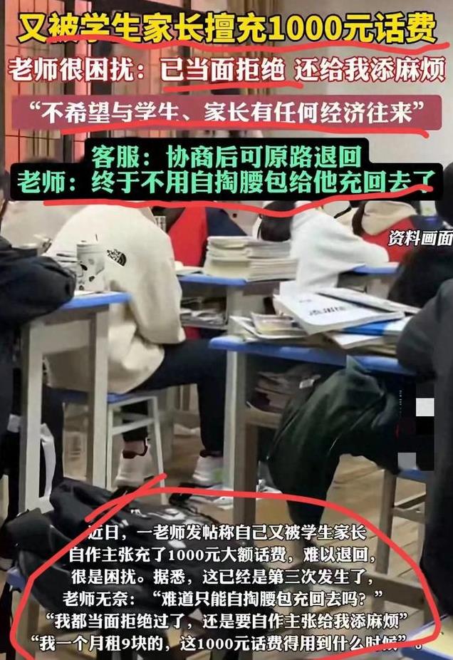 这位家长不听劝,多次私自给老师充了1000元话费,还美其名曰“感谢老师对孩子的关心”。而这位老师并不领情,反而觉得非常尴尬和无奈。