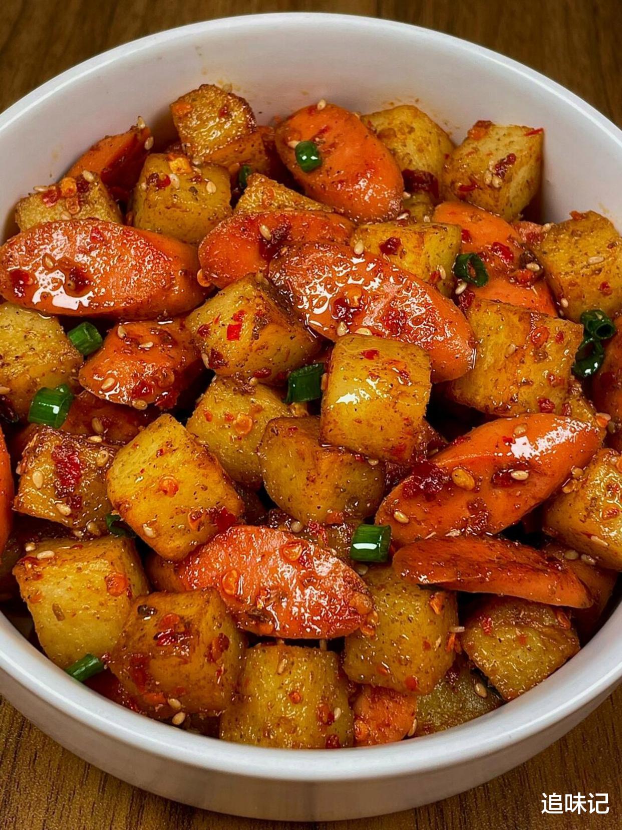 孜然火腿土豆丁土豆丁外焦里嫩,火腿片煎得微焦,混合着孜然、辣椒的香味,再加上白芝麻和葱花点缀,口感丰富,香辣过瘾。