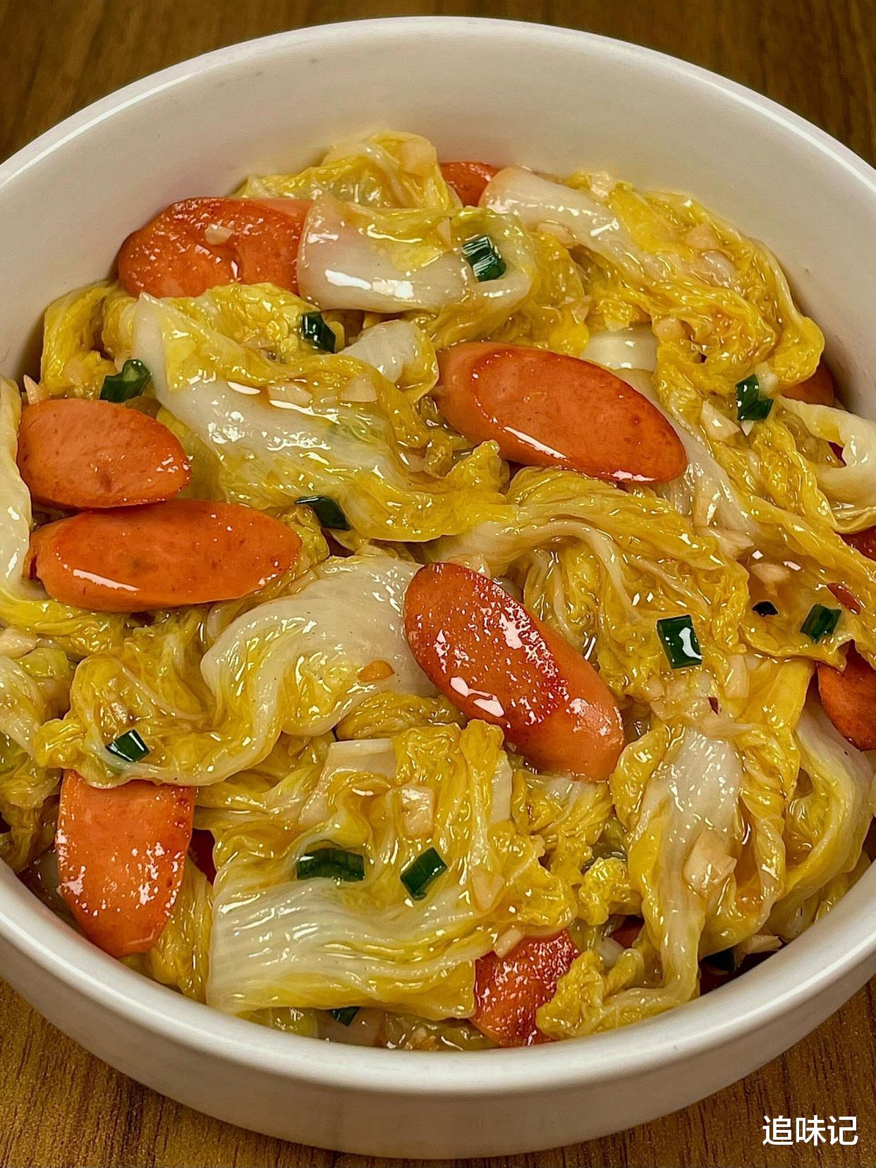娃娃菜炒火腿肠火腿肠煎得焦香,娃娃菜炒得软嫩,搭配蒜末和生抽、蚝油调味,简单又美味,清爽中带着浓郁的肉香。