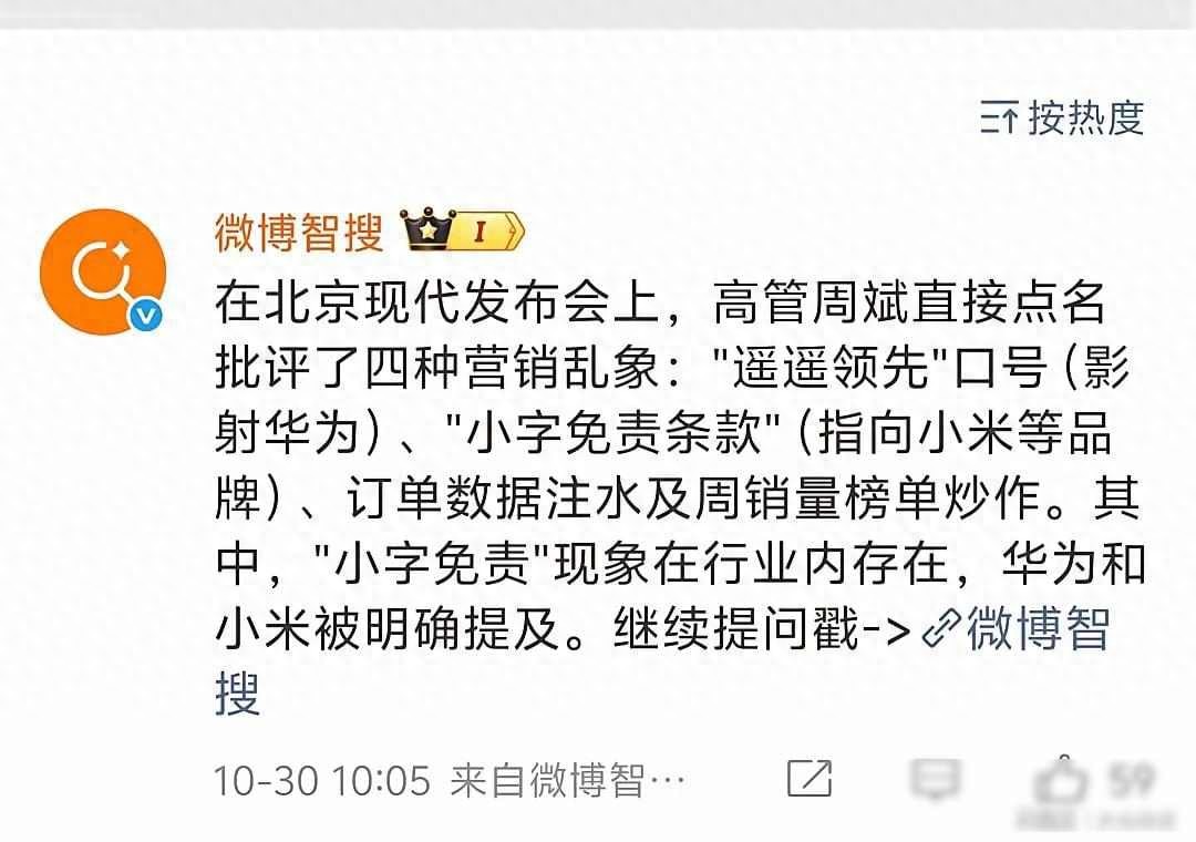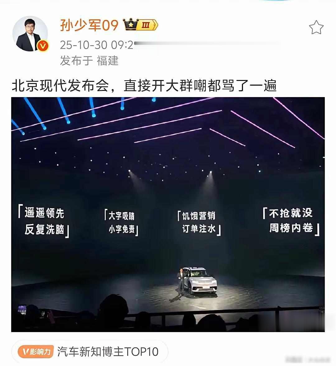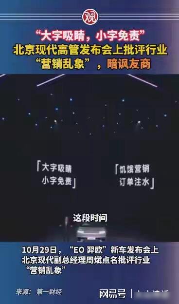 2024年10月29号晚上,北京现代举行新车发布会,一位叫周斌的高管拿着PPT上台发言,直接指出行业里那些“遥遥领先”“订单注水”“小字免责”的做法让人反感,虽然没有点名具体对象,但现场观众都明白这些话是针对华为鸿蒙智行说的。