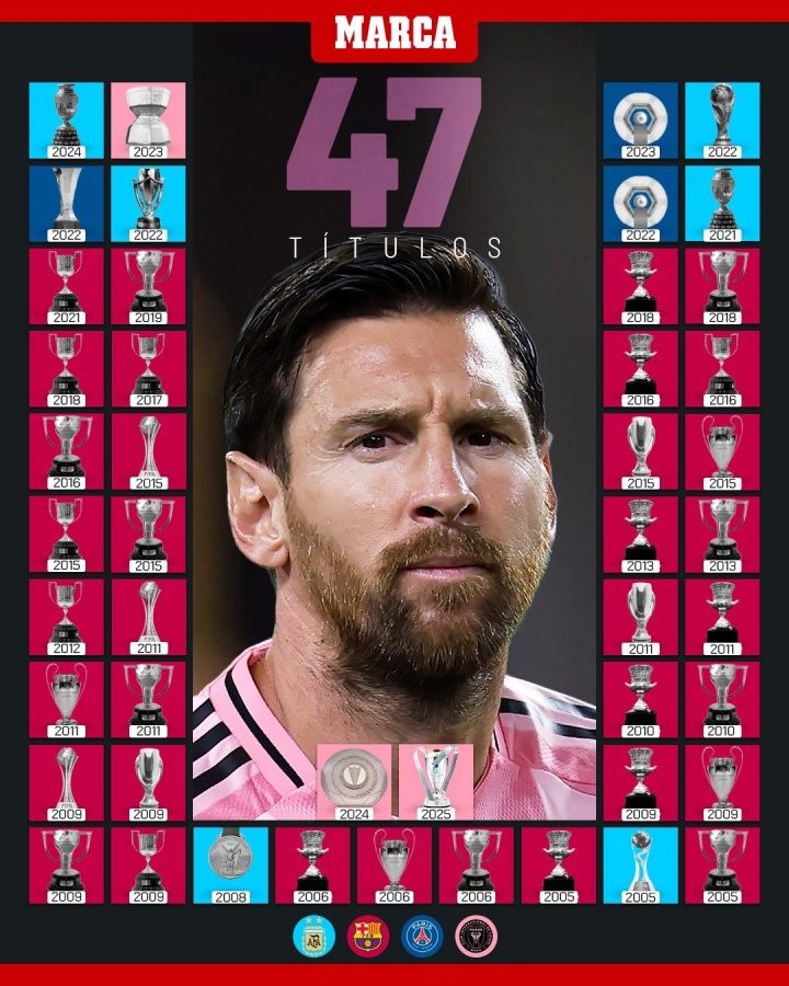 梅西已经在近二十年的职业生涯中收获了47个冠军,他的目标是拿到50个冠军之后再退役。参考阿根廷国家队和迈阿密国际的状态,梅西大概率可以实现这个目标,以完美的姿态结束球员生涯。