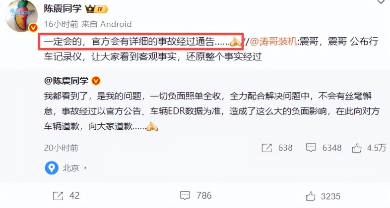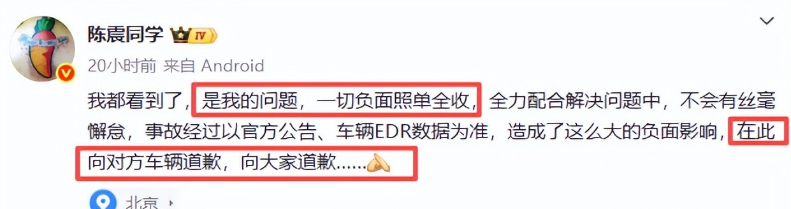 10月4日,陈震就事件发文致歉,称会负起责任,配合调查,并向对方及公众道歉。文中语气诚恳,提及事故细节以官方公告和车辆EDR数据为准。
