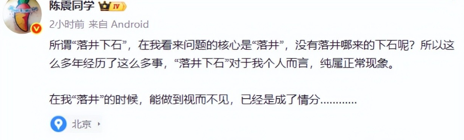 陈震看到相关文章后转发并道歉,称:“给您和您的家庭带来了伤害,实在对不起,我会全力配合后续工作和赔偿。”态度明确。