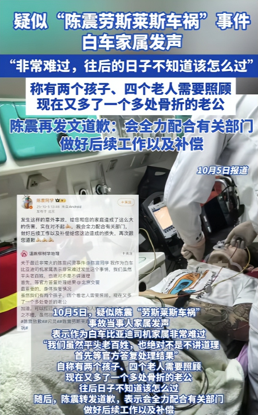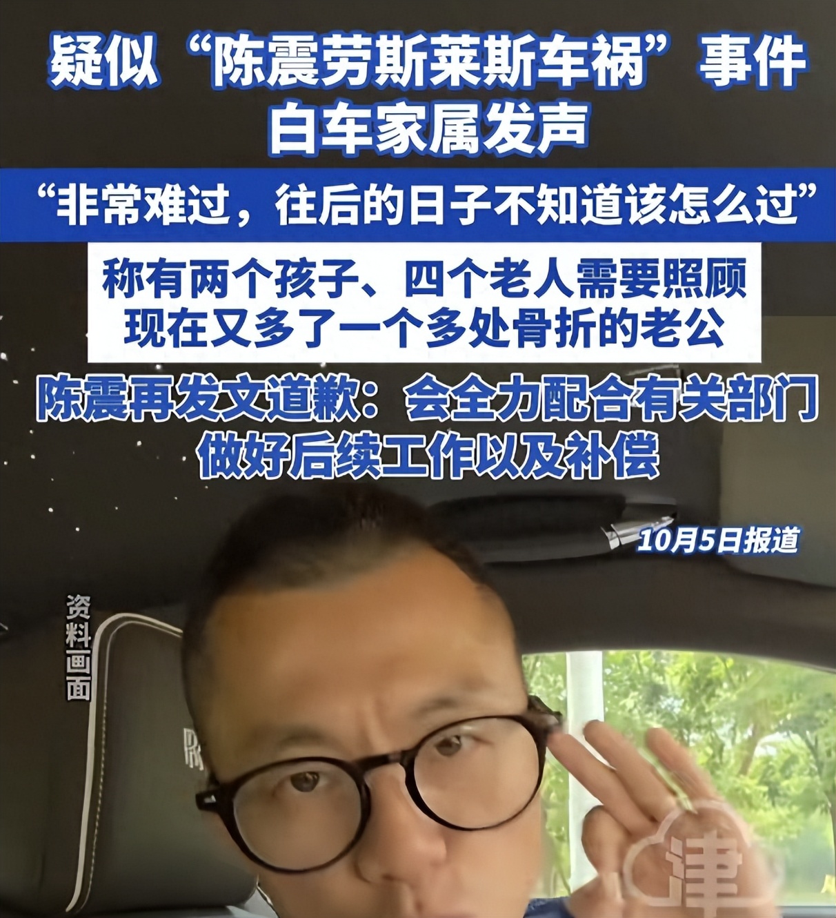 被撞的对方司机却陷入困境。10月5日,媒体转载“疑似陈震车祸事件,白色车辆家属发声日子难过”,赔偿事宜似乎尚未解决。