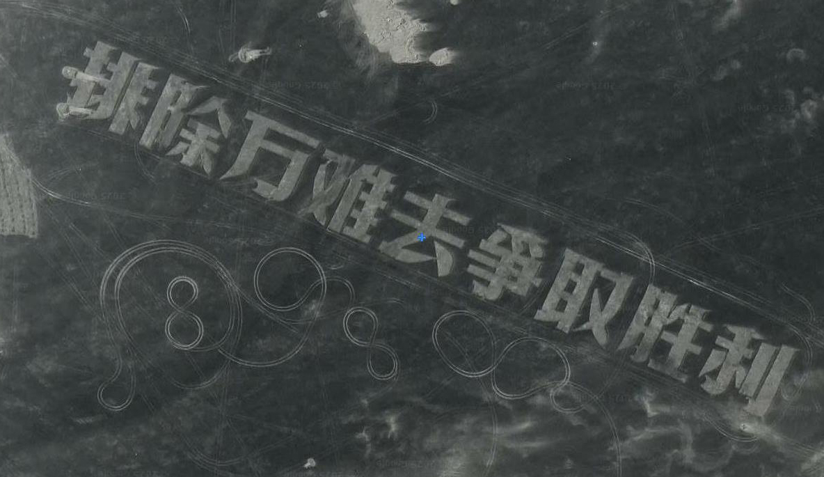 从人文景观的角度来看,这些航标更是精神传承与地域文化的完美融合。每一个字都蕴含着深刻的精神象征:“为人民服务”,字长50米、宽50米,笔画如马路般宽阔,这不仅是字面的呈现,更是人民军队宗旨的生动体现,象征着空军对人民的庄严承诺;“只争朝夕”,反映了当时紧迫的国防建设需求,激励着官兵们争分夺秒地训练;“排除万难去争取胜利”,彰显了官兵们在艰苦环境中克服困难的坚定决心;“向斗争中学习”,体现实战化训练理念,强调从实践中积累经验;“毛主席万万岁”,则表达了对领袖的敬仰之情,反映了特定历史时期的政治文化。