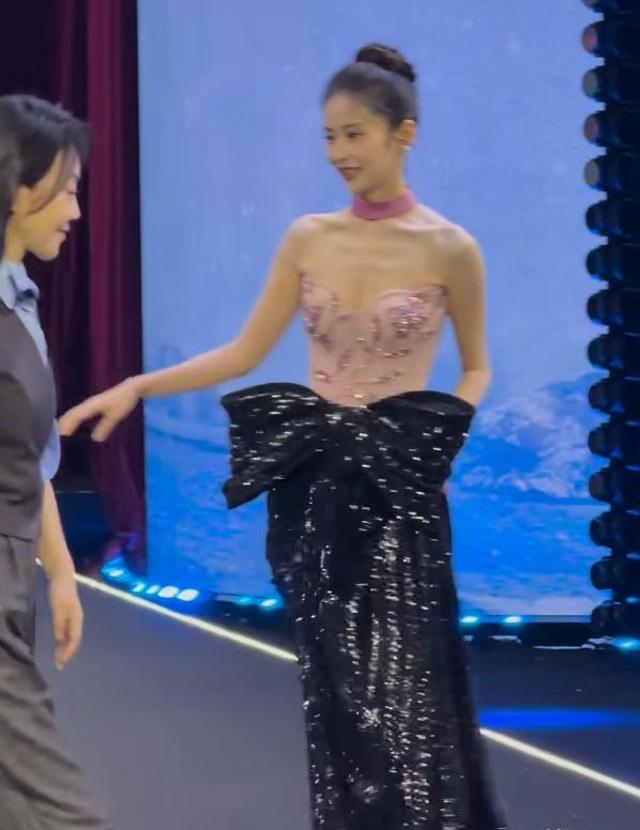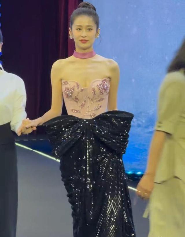 颖儿身穿粉色露肩上衣,把她优越的肩颈线显露出来了,上衣的露肤度稍微有一点高,下面搭配黑色蝴蝶结长裙,在灯光的照耀下blingbling的。
