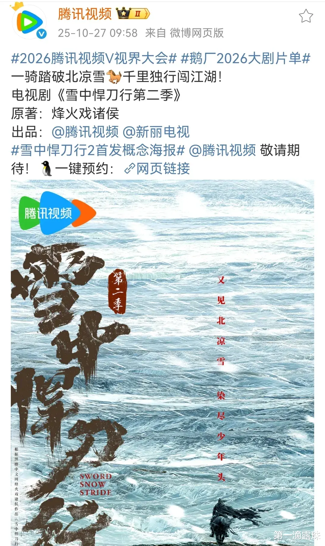 10月27日的“2026腾讯视频V视界大会”上,一张北凉风雪图让武侠迷和张若昀粉丝们彻底沸腾——《雪中悍刀行2》首张概念海报正式发布!海报上,徐凤年单骑独行的剪影在漫天风雪中前行,画面中间一句红色的“又见北凉雪,染尽少年头”,瞬间将网友拉回到追剧《雪中悍刀行》时的回忆之中。