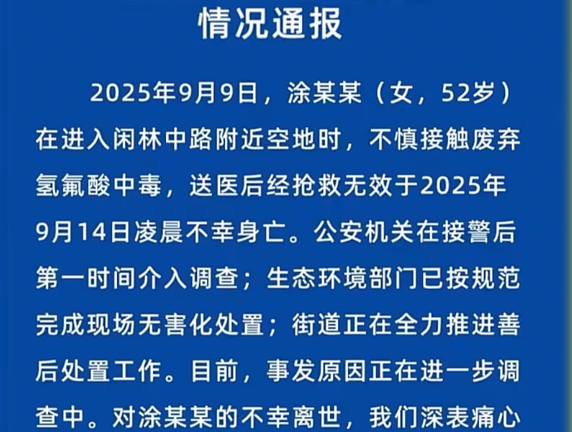 杭州女子误踩氢氟酸中毒身亡后续来了,警方终于锁定了氢氟酸的所有者。现场一共挖出来了三桶,其中一桶是完整的,另外两桶都是残余的。至于氢氟酸的所有者买它是用来干嘛的?从哪里购买的?为什么会随意扔在道路上?警方目前正在调查中,相信不用很久就会公布真相。