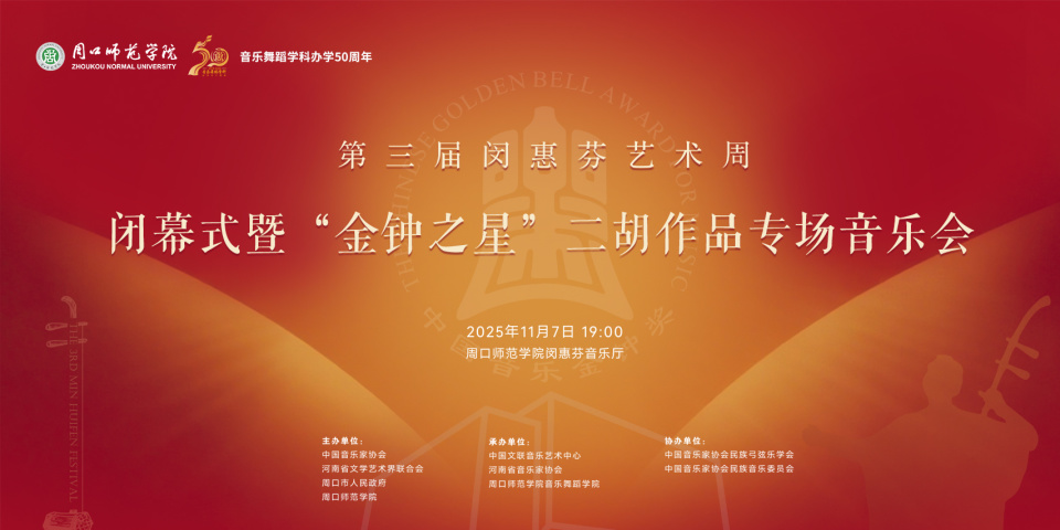 为深入学习贯彻党的二十大精神,认真落实习近平总书记关于文艺工作的重要讲话,弘扬中华优秀传统文化,值此二胡艺术大师闵惠芬先生诞辰80周年之际,由中国音乐家协会、河南省文学艺术界联合会、周口市人民政府、周口师范学院共同主办的第三届“闵惠芬艺术周”将于2025年11月5日-7日在周口师范学院隆重举行。