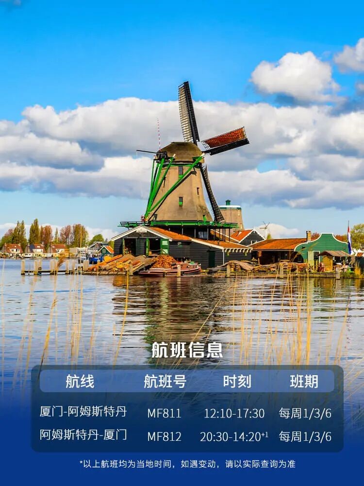 根据航班信息,去程航班MF811于12:10从厦门起飞,当地时间17:30抵达阿姆斯特丹;回程航班MF812于20:30起飞,次日14:20抵达厦门。新航季自3月29日起执行,此次航班加密将进一步提升中欧航线运力供给,更好满足商务、旅游及探亲等多元化出行需求。