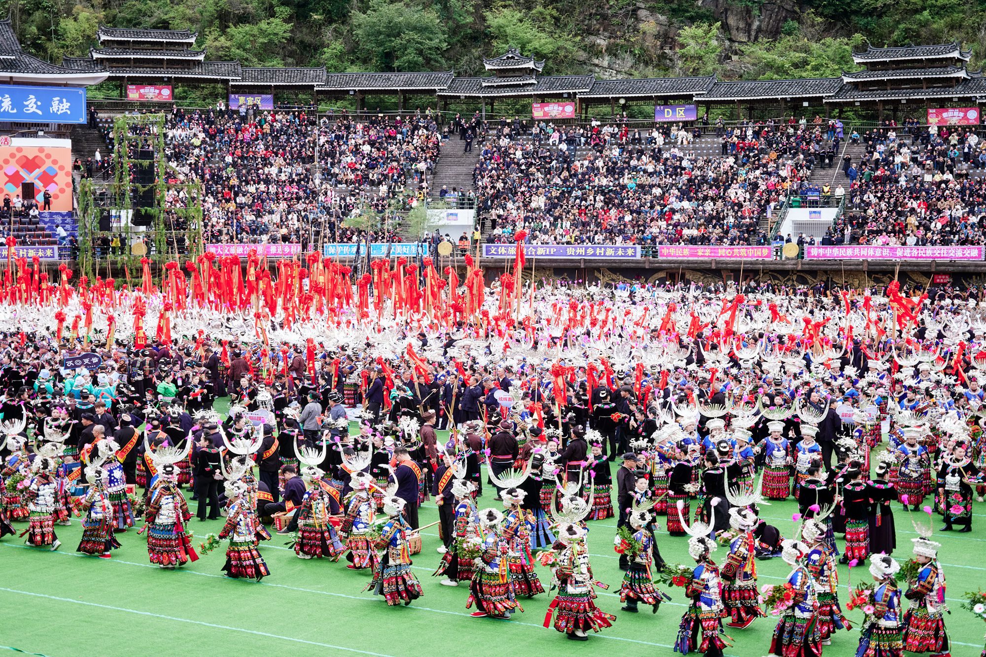 巨型银角装饰着舞台,舞台背后就是苗家层层叠叠的吊脚楼。巡游的队伍在跑道上绕行,银角、银冠在阳光下汇成“银色海洋”,配合着悠扬的苗家乐曲,场面十分壮观。
