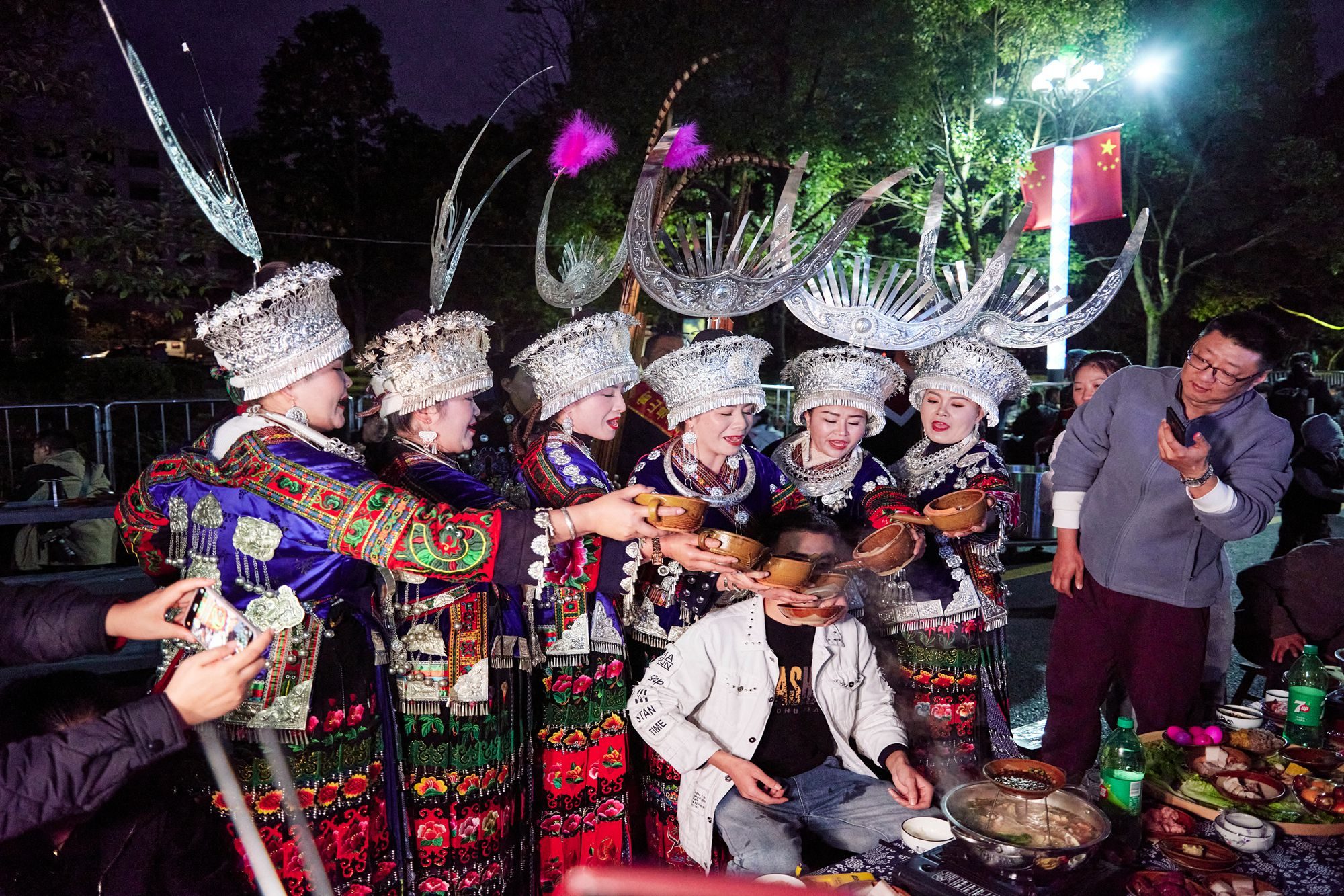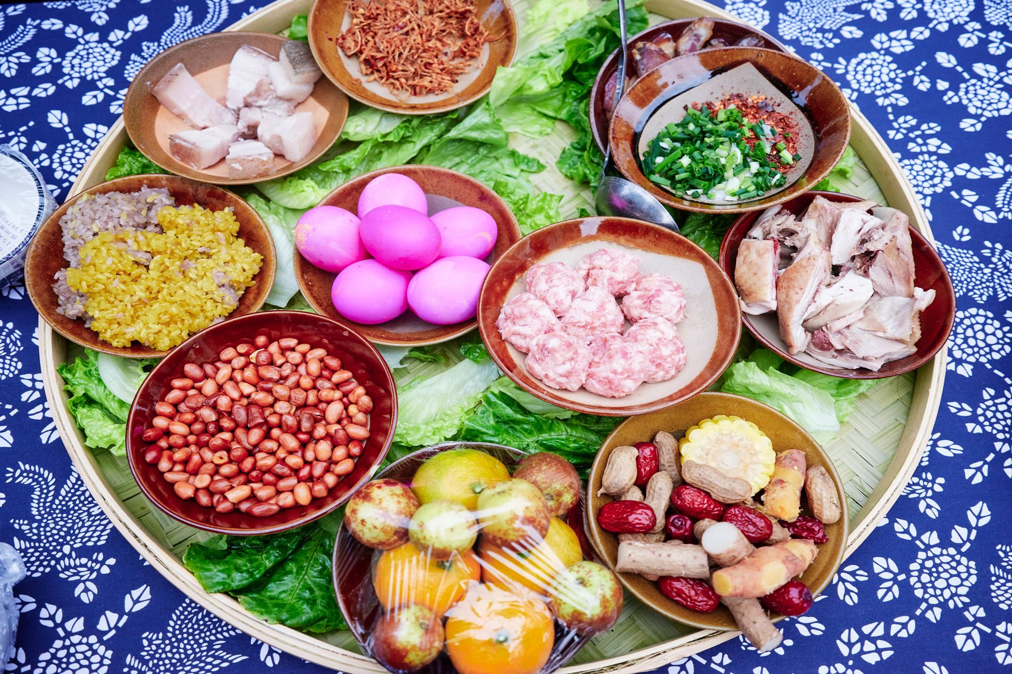 苗家人庆祝新年同样少不了美食,长桌宴就是必选。大大的竹盘中盛着紫色彩蛋、五色糯米饭、白切鸡等食物,从水果蔬菜到肉类主食一应俱全,不仅美观好看又好吃,营养也十分均衡。