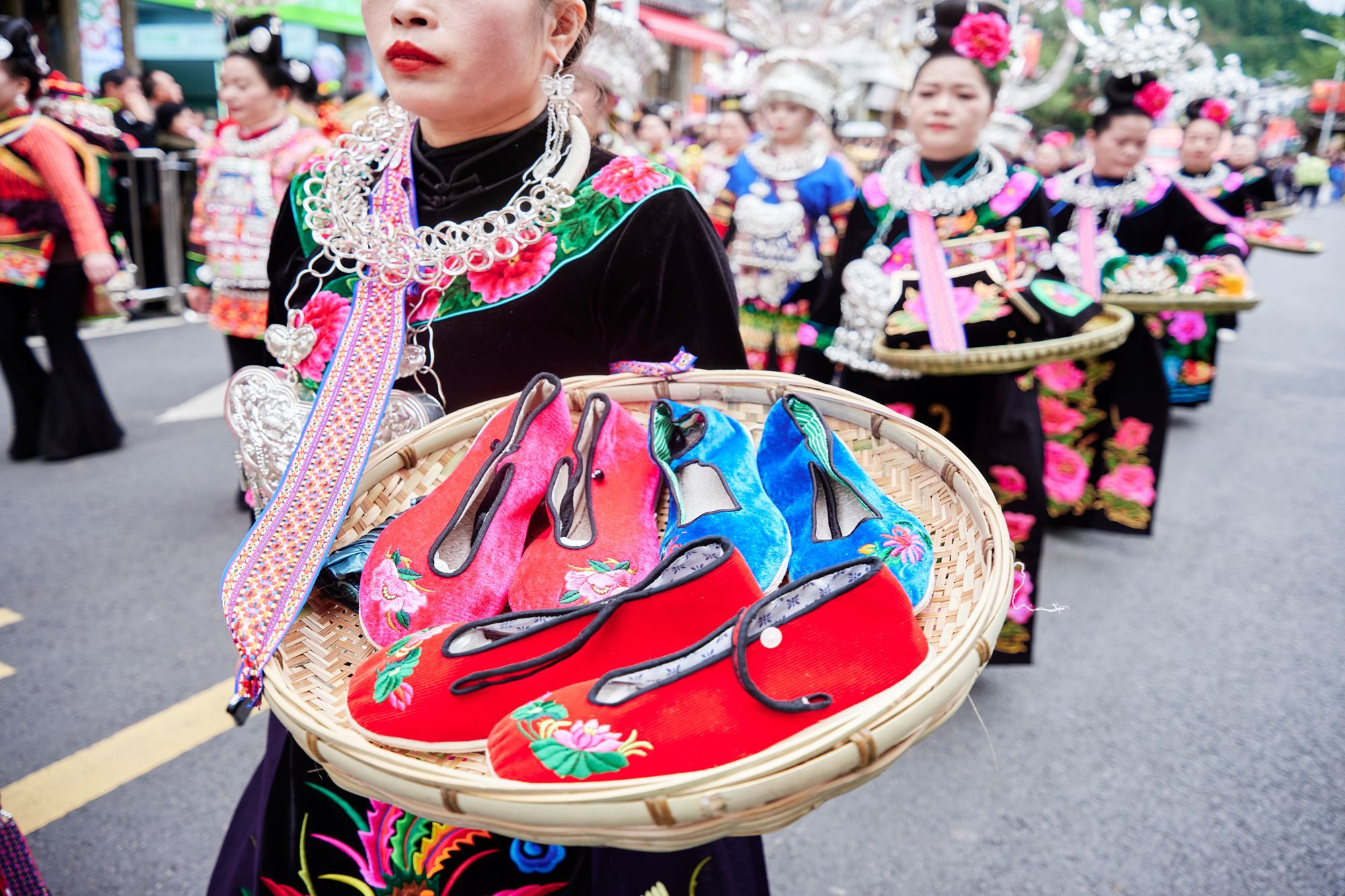 年长一些的苗族妇女手捧竹篮,展示着苗族的传统手工艺制品。绣花鞋都是亲手缝制,花鸟鱼虫的图案栩栩如生,配色大胆又鲜亮,一针一线尽是苗族人对生活的热爱和向往。