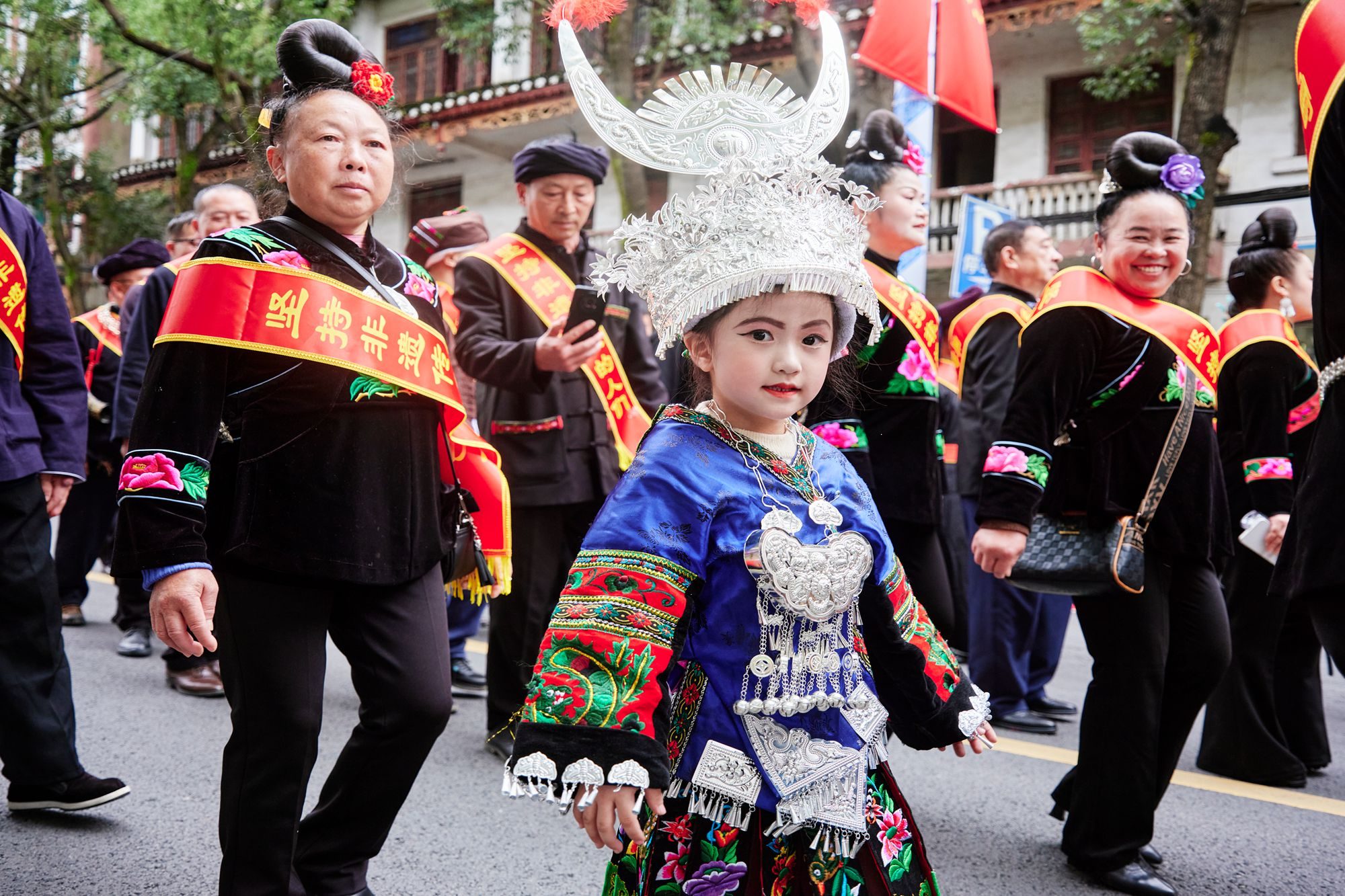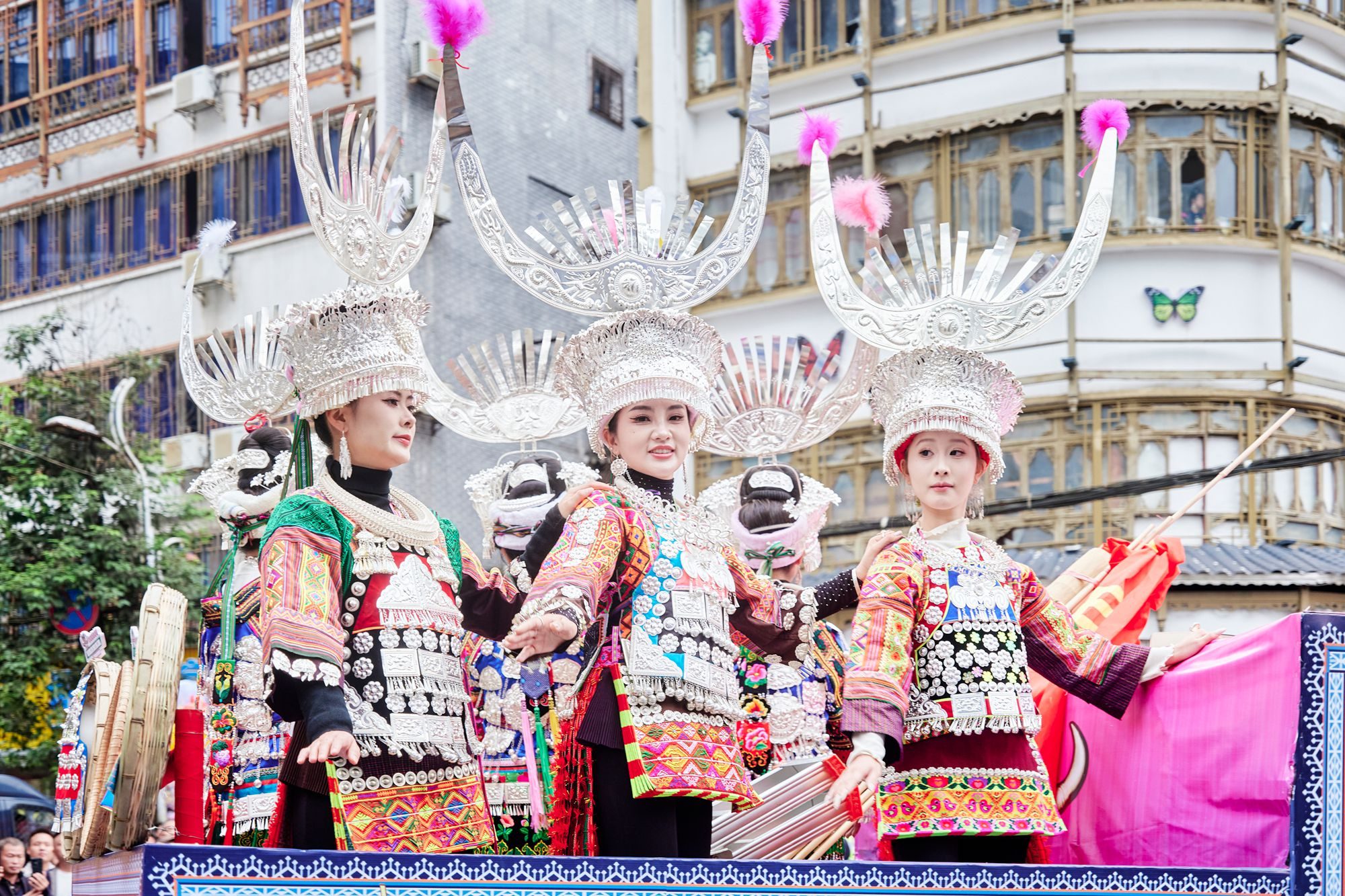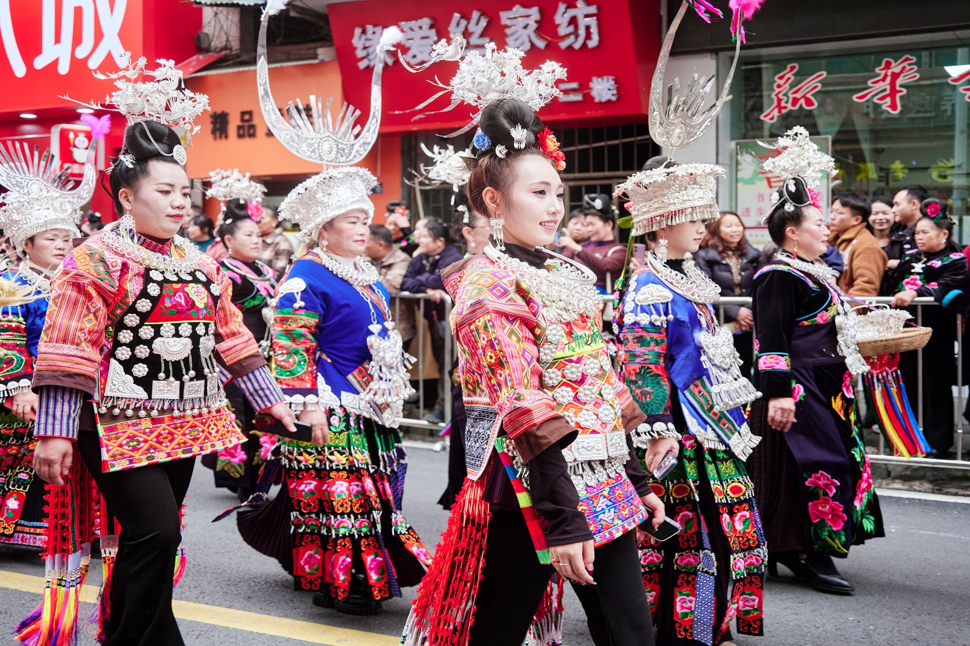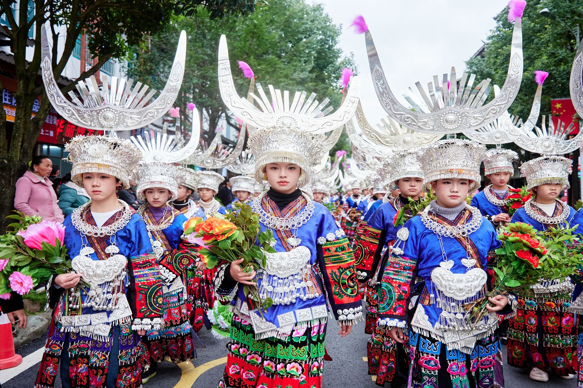 巡游中的苗族姑娘盛装而行,她们头戴银饰,这些银饰从几斤到十几斤不等,是苗家姑娘的“传家宝”,在阳光的照耀下晃得人睁不开眼。